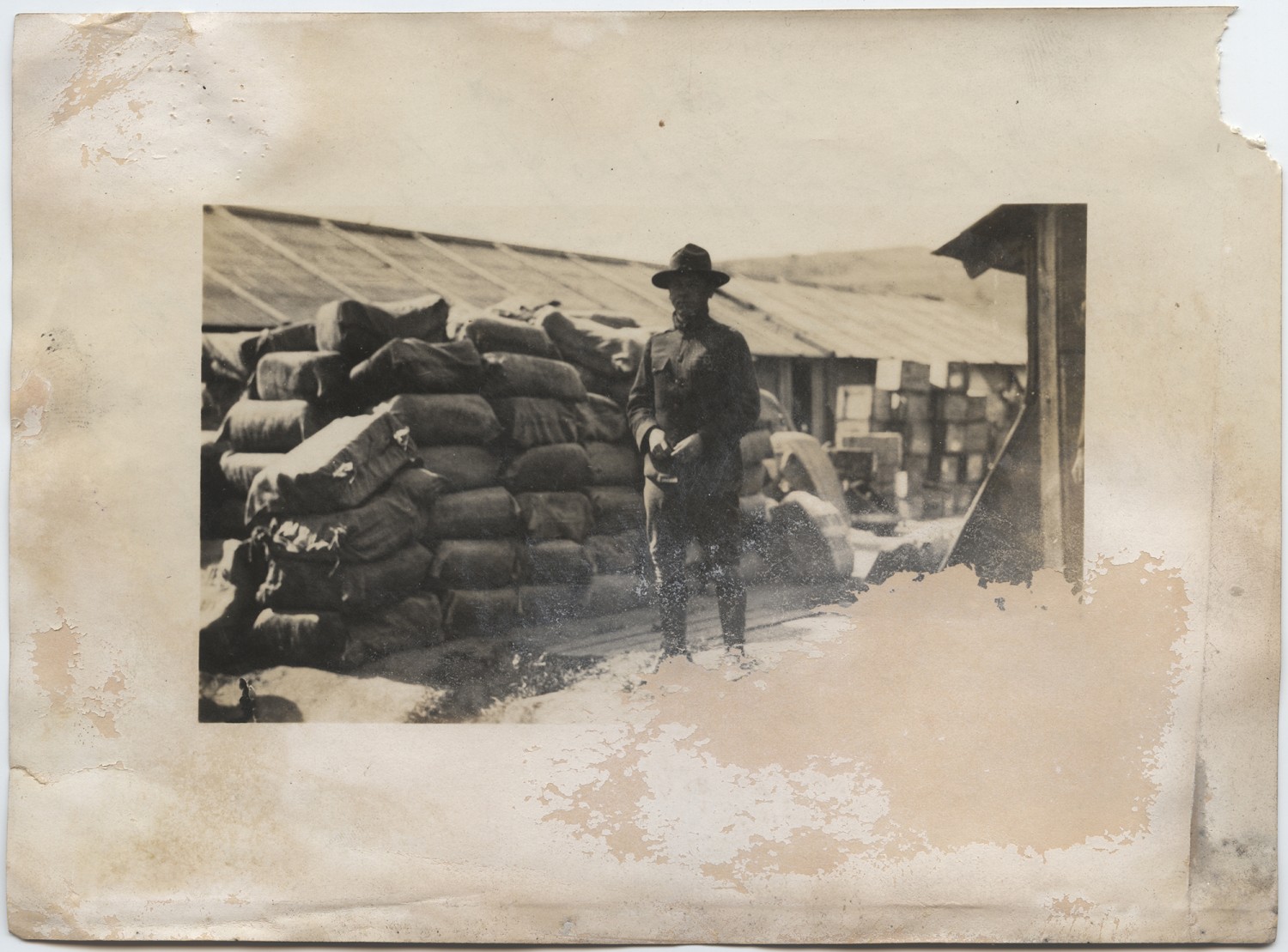 | Description | Otto Higgins did not serve in the United States military, but was assigned as a war correspondent for the Kansas City Star soon after the United States entered the world conflict and was with the American forces in all the major engagements in which they participated. He wrote and photographed soldiers from the Mid-West, especially Missouri and Kansas. Higgin's began his service with the old Third Regiment, and was with regiments at Camp Nichols, Fort Riley, Camp Funston, Camp Doniphan, Fort Leavenworth, Fort Sheridan, and finally in France. This is a photograph of the commanding officer of a supply company. He stands in front of supplies for Kansas City, Missouri soldiers fighting in the mountains. The supplies are located at a base located at the foot of the mountain and are sent up the mountain by pack mules. |