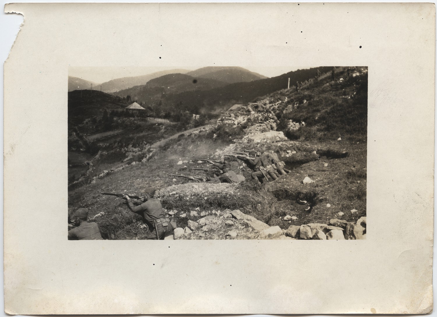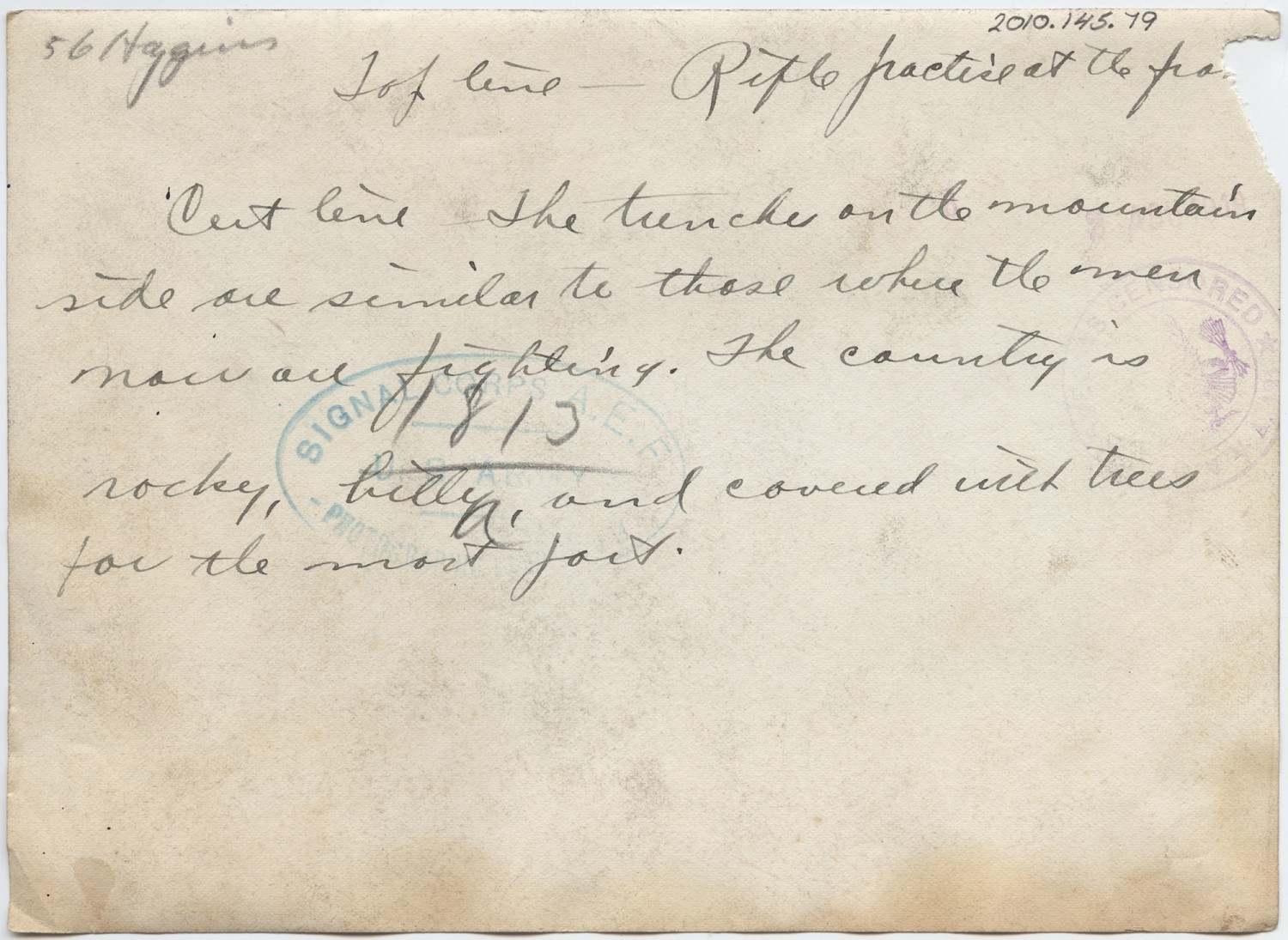 56 Higgins Top line- Rifle practice at the [ms torn] Cut line- The trenches on the mountain side are similar to those where the men now are fighting. The country is rocky, hilly, and covered with trees for the most part.