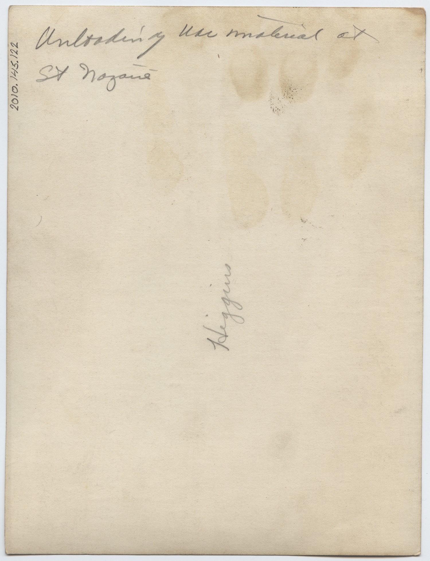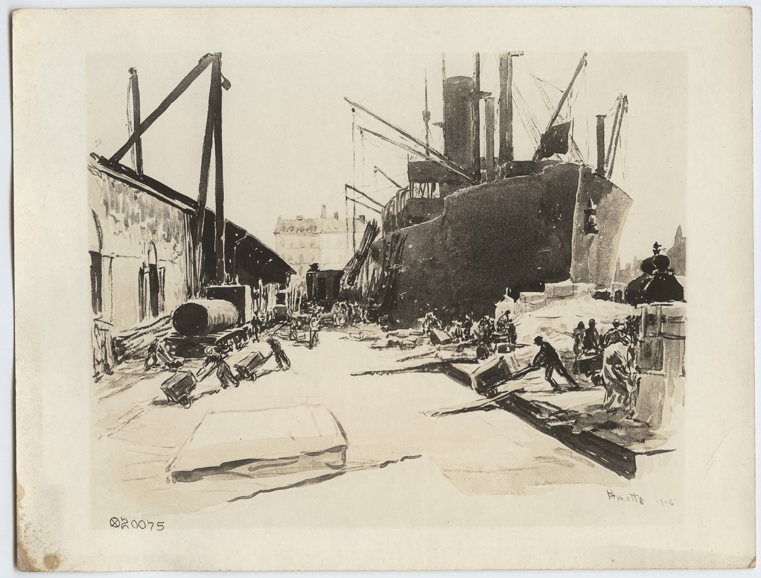 | Source | Higgins, Otto P. Unloading war material at St. Nazaire. n.d. Higgins, Otto P. Collection. 2010.145.122. The National World War I Museum, Kansas City, Missouri. |
