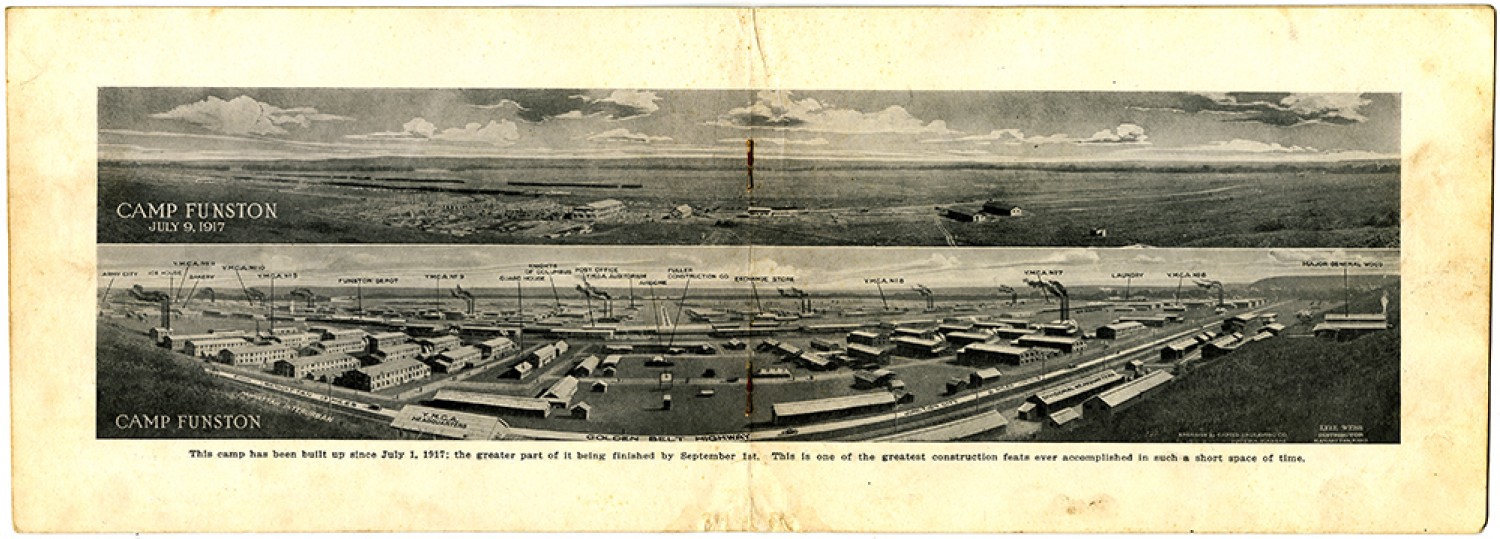 CAMP FUNSTON JULY 9, 1917 ARMY CITY ICE HOUSE Y.M.C.A. No 11 BAKERY Y.M.C.A. No 10 Y.M.C.A. No 5 FUNSTON DEPOT Y.M.C.A. No 9 GUARD HOUSE KNIGHTS OF COLUMBUS POSTER OFFICE Y.M.C.A. AUDITORIUM AIRDOME FULLER CONSTRUCTION CO. EXCHANGE STORE Y.M.C.A. No 8 Y.M.C.A. No 7 LAUNDRY Y.M.C.A. No 6 MAJOR GENERAL WOOD CAMP FUNSTON MANHATTAN 13 MILES MANHATTAN INTERURBAN Y.M.C.A. HEADQUARTERS GOLDEN BELT HIGHWAY JUNCTION CITY 8 MILES DIVISIONAL HEADQUARTERS ENGRAVED By CAPPER ENGRAVING CO. TOPEKA, KANSAS LYLE WEBB DISTRIBUTOR MANHATTAN, KANS. This camp has been built up since July 1, 1917; the greater part of it being finished by September 1st . This is one of the greatest construction feats ever accomplished in such a short space of time.