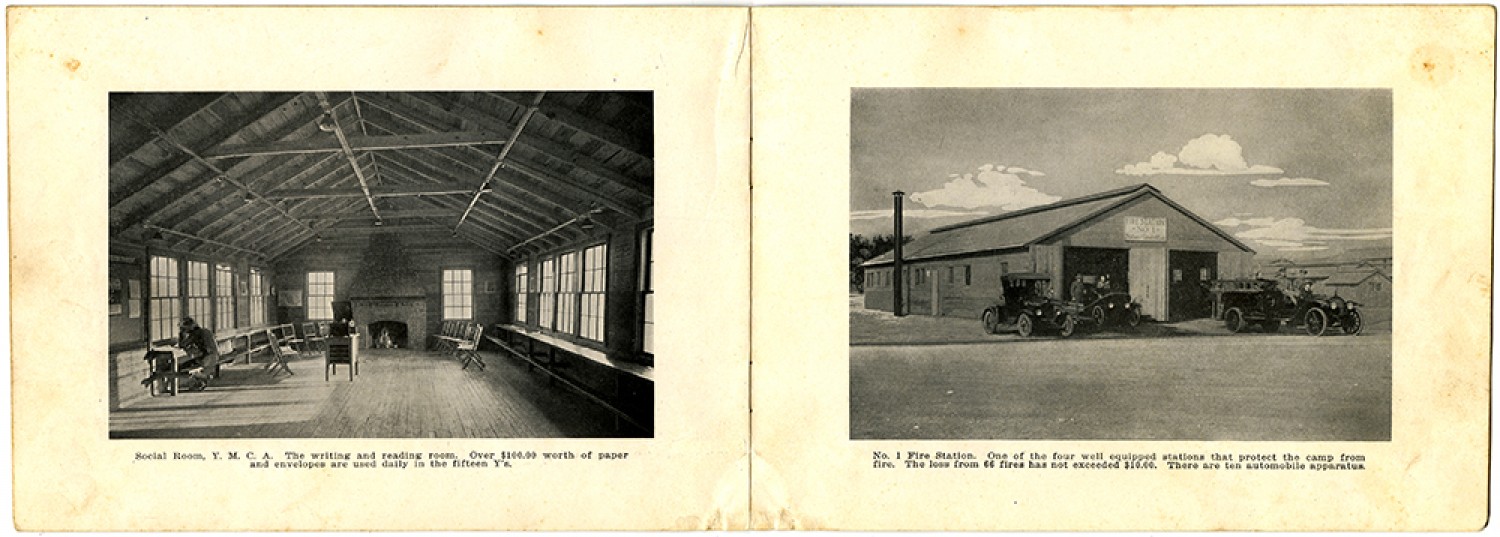 Social Room, Y.M.C.A. The writing and reading room. Over $100,000 worth of paper and envelopes are used daily in the fifteen Y’s. No. 1 Fire Station. One of the four well equipped stations that protect the camp from fire. The loss from 66 fires has not exceeded $10.00. There are ten automobile apparatus.