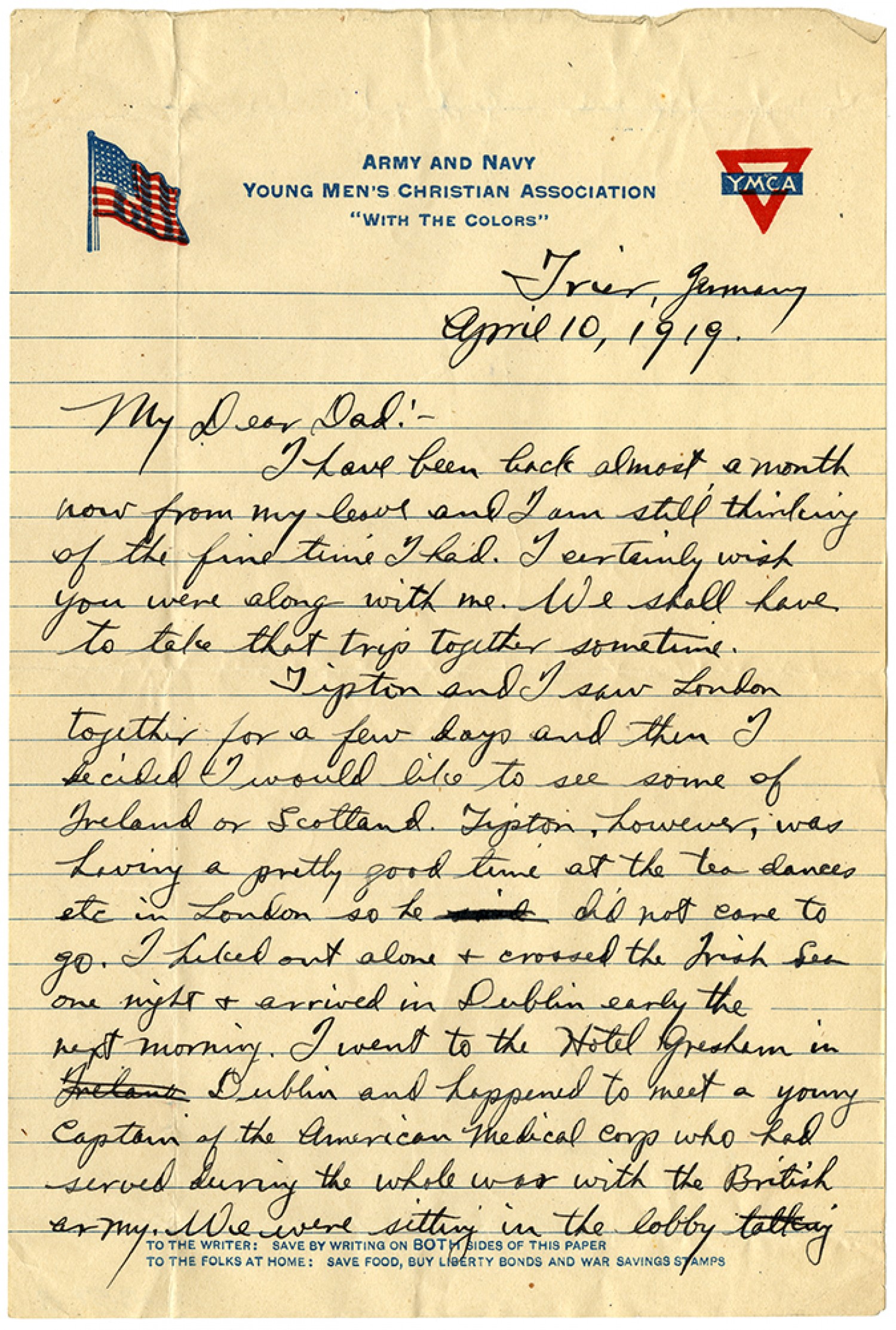 Trier Germany April 10, 1919. My Dear Dad: - I have been back almost a month now from my leave and I am still thinking of the fine time I had. I certainly wish you were along with me. We shall have to take that trip together sometime. Tipton and I saw London together for a few days and then I decided I would like to see some of Ireland or Scotland. Tipton, however, was having a pretty good time at the tea dances etc in London so he did not care to go. I hiked out alone & crossed the Irish Sea one night & arrived in Dublin early the next morning. I went to the Hotel Gresham in Dublin and happened to meet a young Captain of the American Medical Corp who had served during the whole war with the British army. We were sitting in the lobby talking