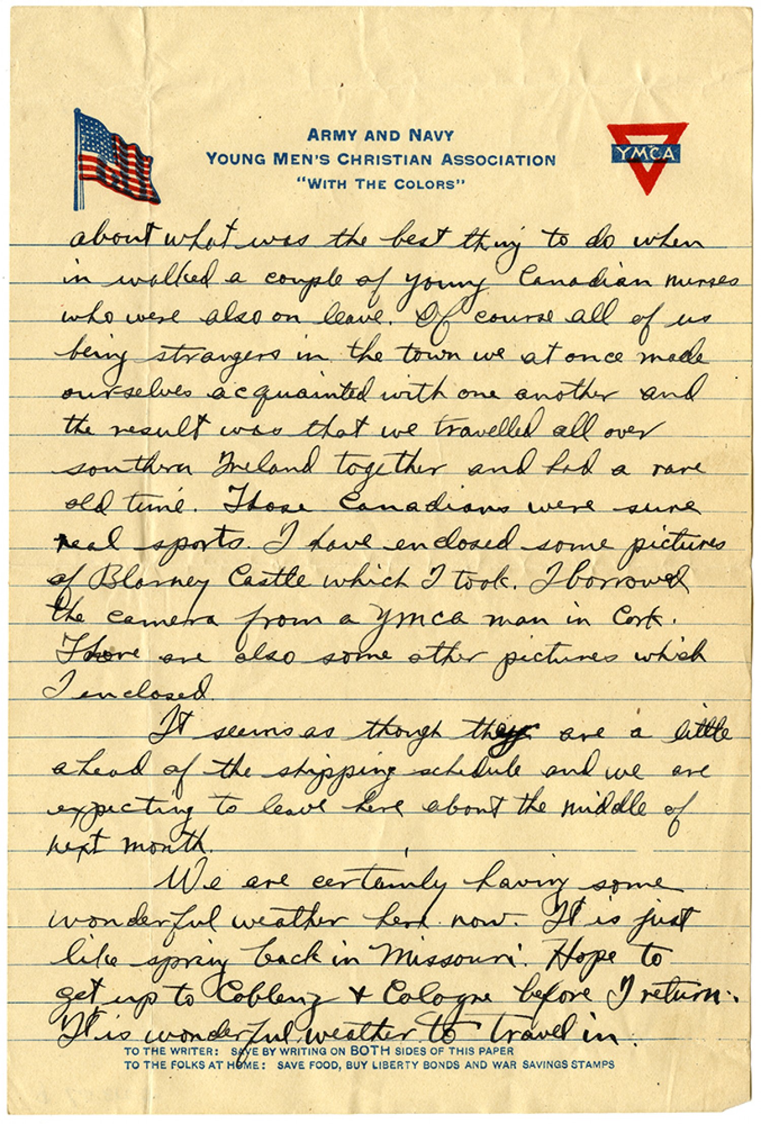 about what was the best thing to do when in walked a couple of young Canadian nurses who were also on leave. Of course all of us being strangers in the town we at once made ourselves acquainted with one another and the result was that we travelled all over southern Ireland together and had a rare old time. Those Canadians were sure real sports. I have enclosed some pictures of Blarney Castle which I took. I borrowed the camera from a YMCA man in Cork. There are also some other pictures which I enclosed. It seems as though they are a little ahead of the shipping schedule and we are expecting to leave here about the middle of next month. We are certainly having some wonderful weather here now. It is just like spring back in Missouri. Hope to get up to Coblenz & Cologne before I return. It is wonderful weather to travel in.