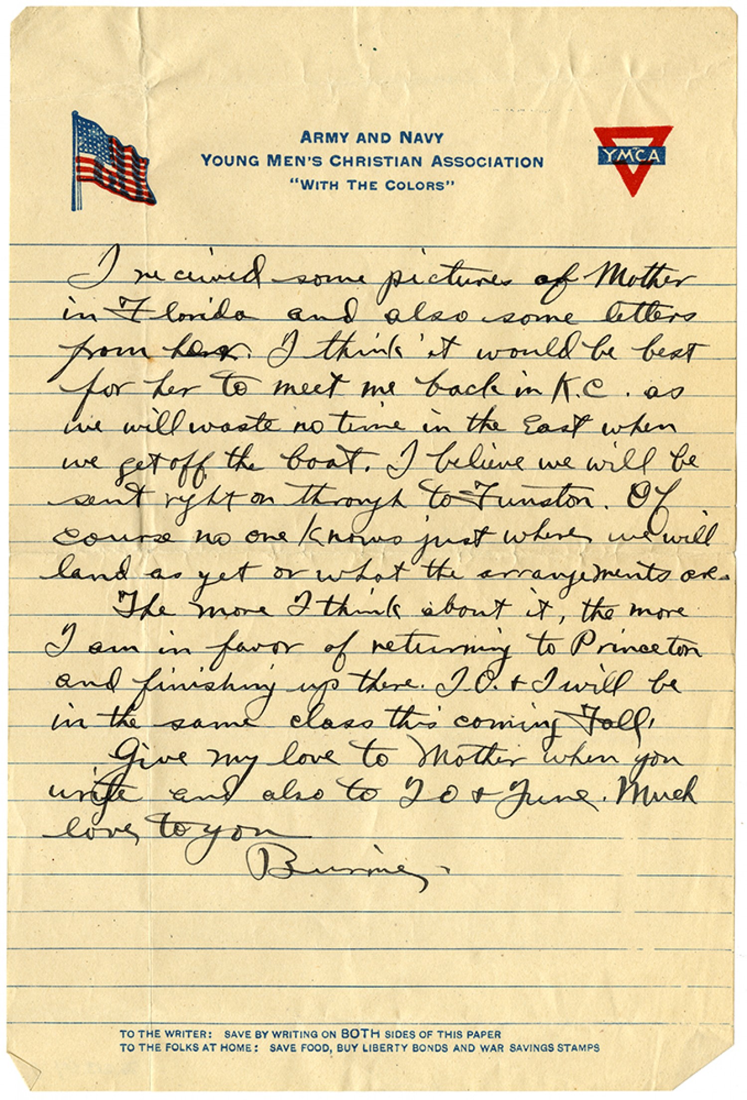 I received some pictures of Mother in Florida and also some letters from her. I think it would be best for her to meet me back in K.C. as we will waste no time in the East when we get off the boat. I believe we will be sent right on through to Funston. Of course no one knows just where we will land as yet or what the arrangements are. The more I think about it, the more I am in favor of returning to Princeton and finishing up there. I. O. & I will be in the same class this coming Fall. Give my love to Mother when you write and also to IO & June. Much love to you Burnie.
