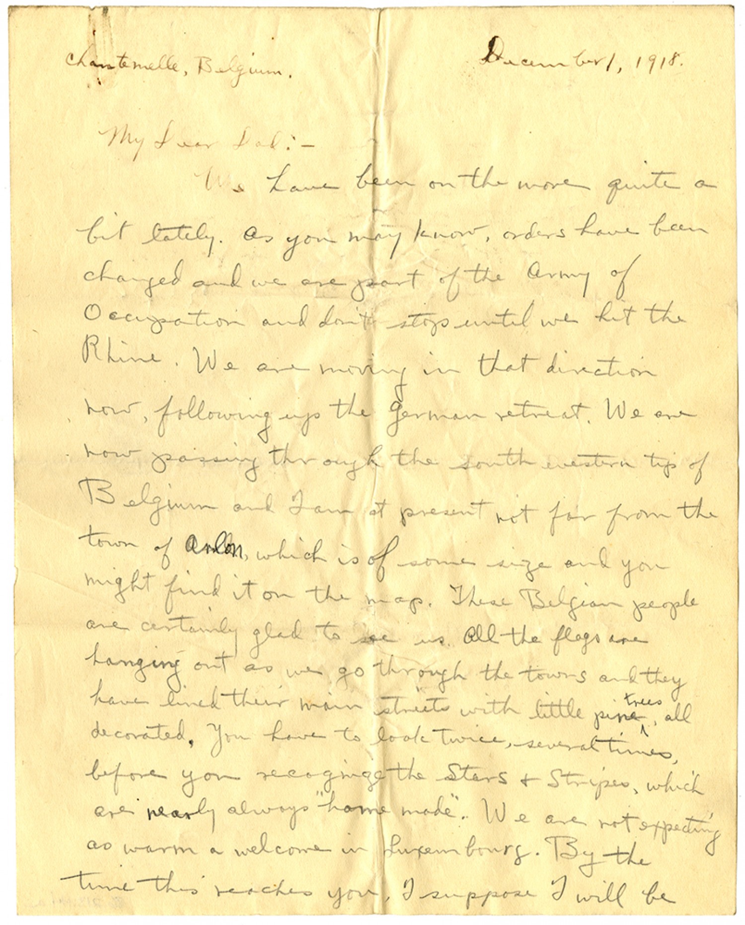 December 1, 1918 Chantemelle, Belgium. My Dear Dad : - We have been on the move quite a bit lately. As you may know, orders have been changed and we are part of the Army of Occupation and don’t stop until we hit the Rhine. We are moving in that direction now, following up the German retreat. We are now passing through the south western tip of Belgium and I am at present not far from the town of Anon, which is of some size and you might find it on the map. These Belgian people are certainly glad to see us. All the flags are hanging out as we go through the towns and they have lined their main streets with little pine trees, all decorated. You have to look twice, several times, before you recognize the Stars & Stripes, which are nearly always “home made.” We are not expecting as warm a welcome in Luxembourg. By the time this reaches you, I suppose I will be