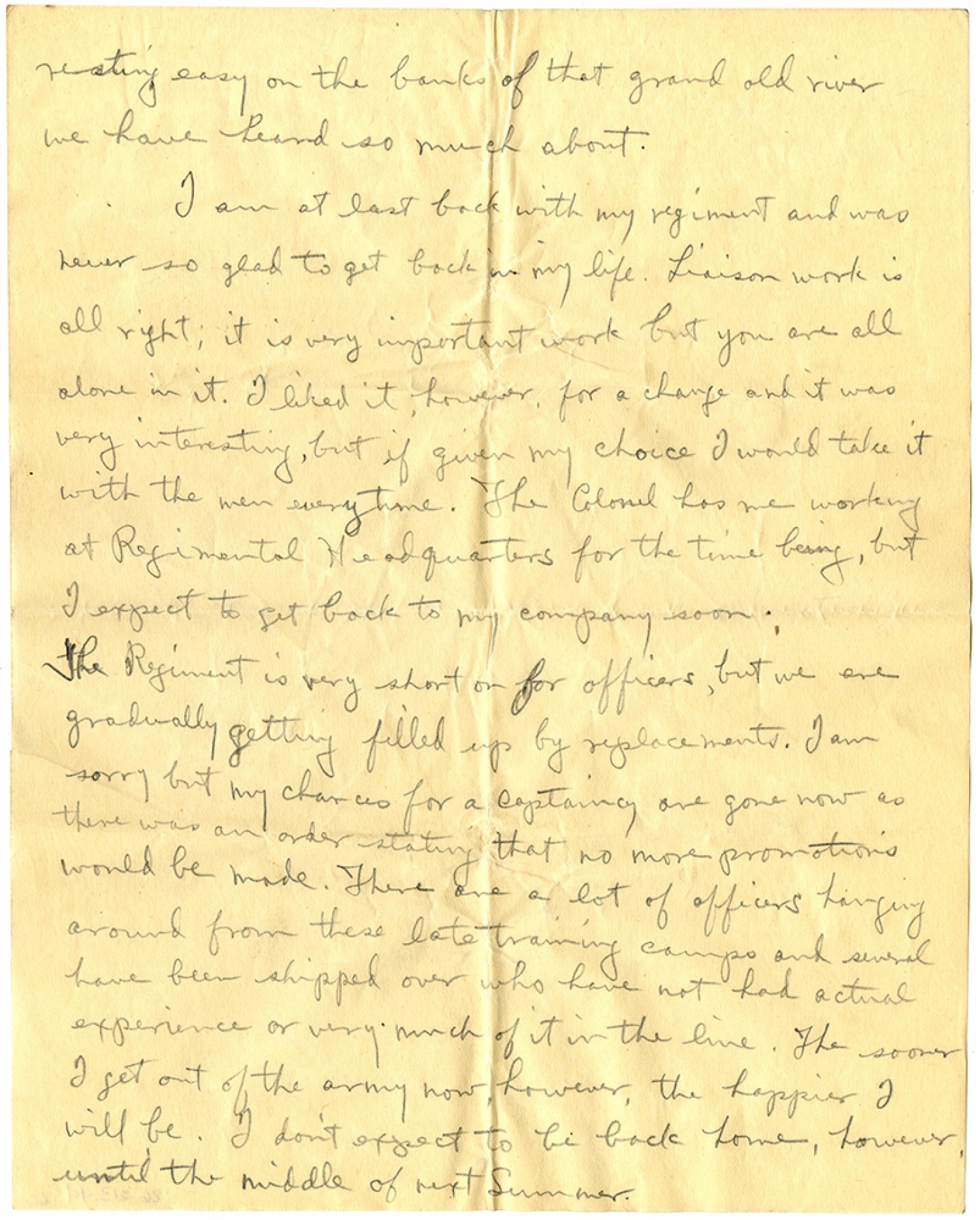 resting easy on the banks of that grand old river we have heard so much about. I am at last back with my regiment and was never so glad to get back in my life. Liaison work is all right; it is very important work but you are all alone in it. I liked it, however, for a change and it was very interesting, but if given my choice I would take it with the men everytime. The Colonel has me working at Regimental Headquarters for the time being, but I expect to get back to my company soon. The Regiment is very short on for officers, but we are gradually getting filled up by replacements. I am sorry but my chances for a captaincy are gone now as there was an order stating that no more promotions would be made. There are a lot of officers hanging around from these late training camps and several have been shipped over who have not had actual experience or very much of it in the line. The sooner I get out of the army how, however, the happier I will be. I don’t expect to be back home, however until the middle of next Summer.