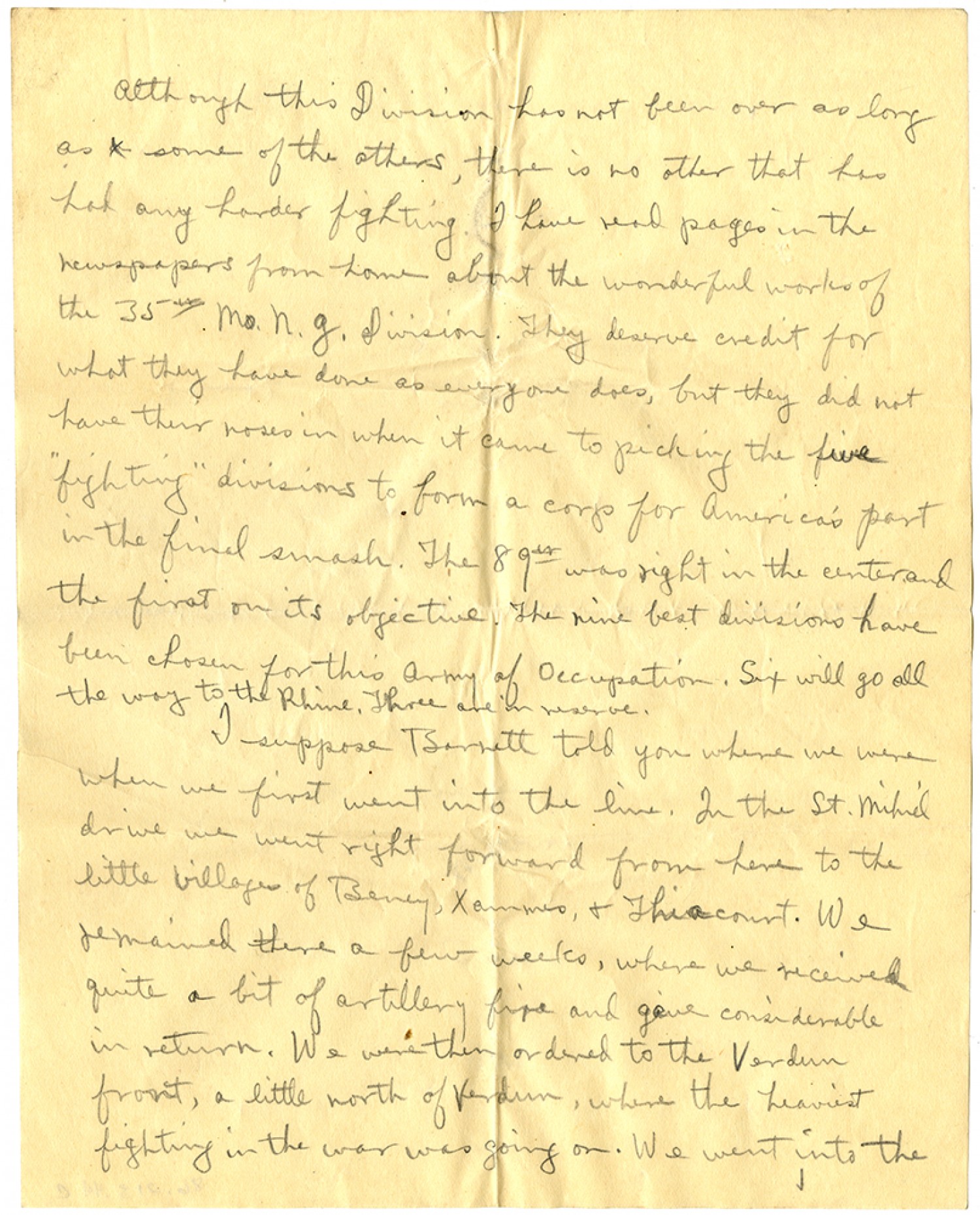 Although this Division has not been over as long as some of the others, there is no other that has had any harder fighting. I have read pages in the newspapers from home about the wonderful works of the 35th Mo. N.G. Division. They deserve credit for what they have done as everyone does, but they did not have their noses in when it came to picking the five “fighting” divisions to form a corp for America’s part in the final smash. The 89th was right in the center and the first on its objective. The nine best divisions have been chosen for this Army of Occupation. Six will go all the way to the Rhine. Three are in reserve. I suppose Barnett told you where we were when we first went into the line. In the St. Mihiel drive we went right forward from here to the little village of Beney, Xammes, & [Thiaucourt]. We remained there a few weeks, where we received quite a bit of artillery fire and gave considerable in return. We were then ordered to the Verdun front, a little north of Verdun, where the heaviest fighting in the war was going on. We went into the
