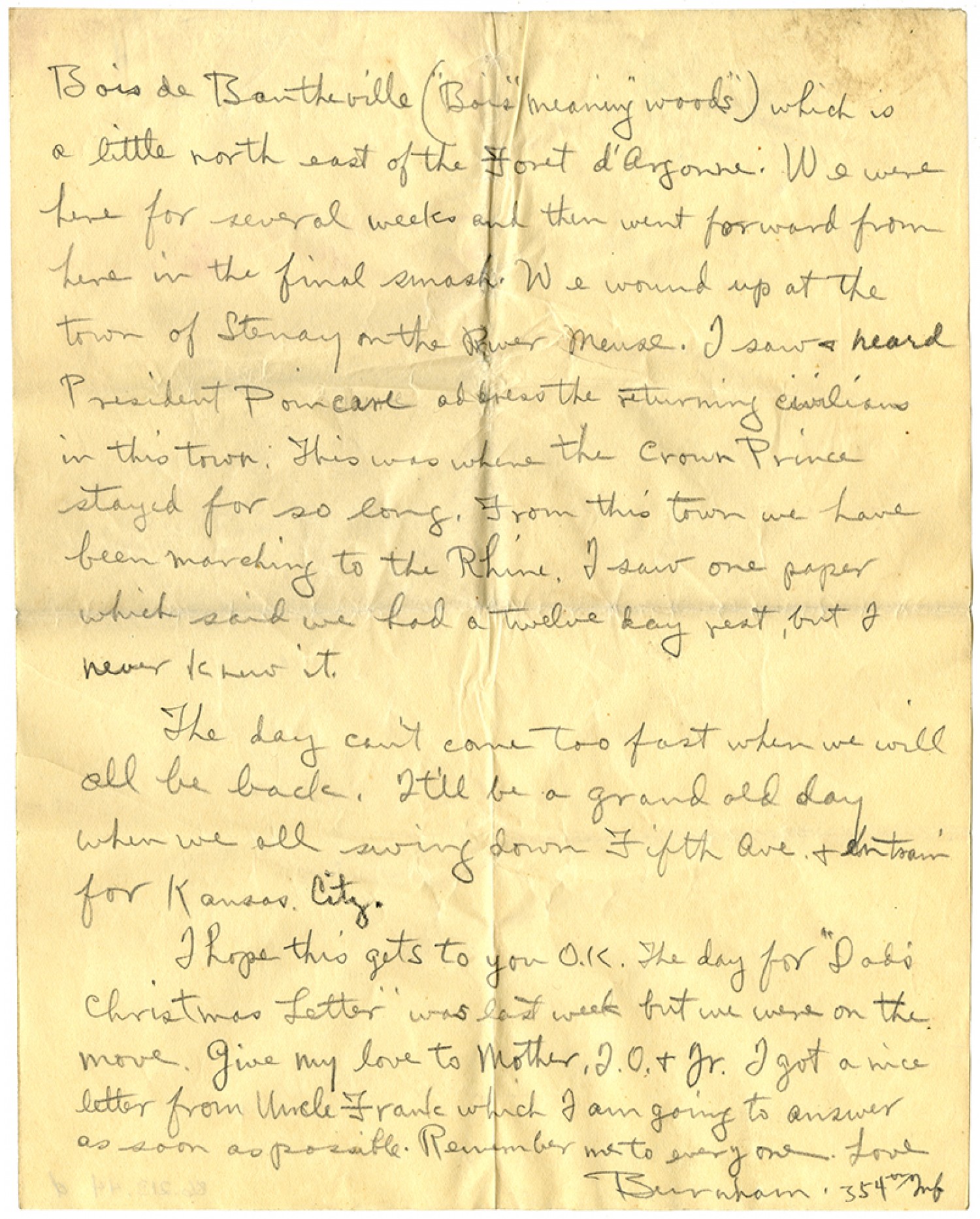 Bois de Bantheville (“Bois” meaning “woods”) which is a little north east of the Foret d’Argonne. We were here for several weeks and then went forward from here in the final smash. We wound up at the town of Stenay on the River Meuse. I saw & heard President Poincare address the returning civilians in this town. This was where the Crown Prince stayed for so long. From this town we have been marching to the Rhine. I saw one paper which said we had a twelve day rest, but I never knew it. The day can’t come too fast when we will all be back. It’ll be a grand old day when we all swing down Fifth Ave. & entrain for Kansas City. I hope this gets to you O.K. The day for “Dad’s Christmas Letter” was last week but we were on the move. Give my love to Mother, I.O. & Jr. I got a nice letter from Uncle Frank which I am going to answer as soon as possible. Remember me to everyone. Love Burnham. 354th Inf