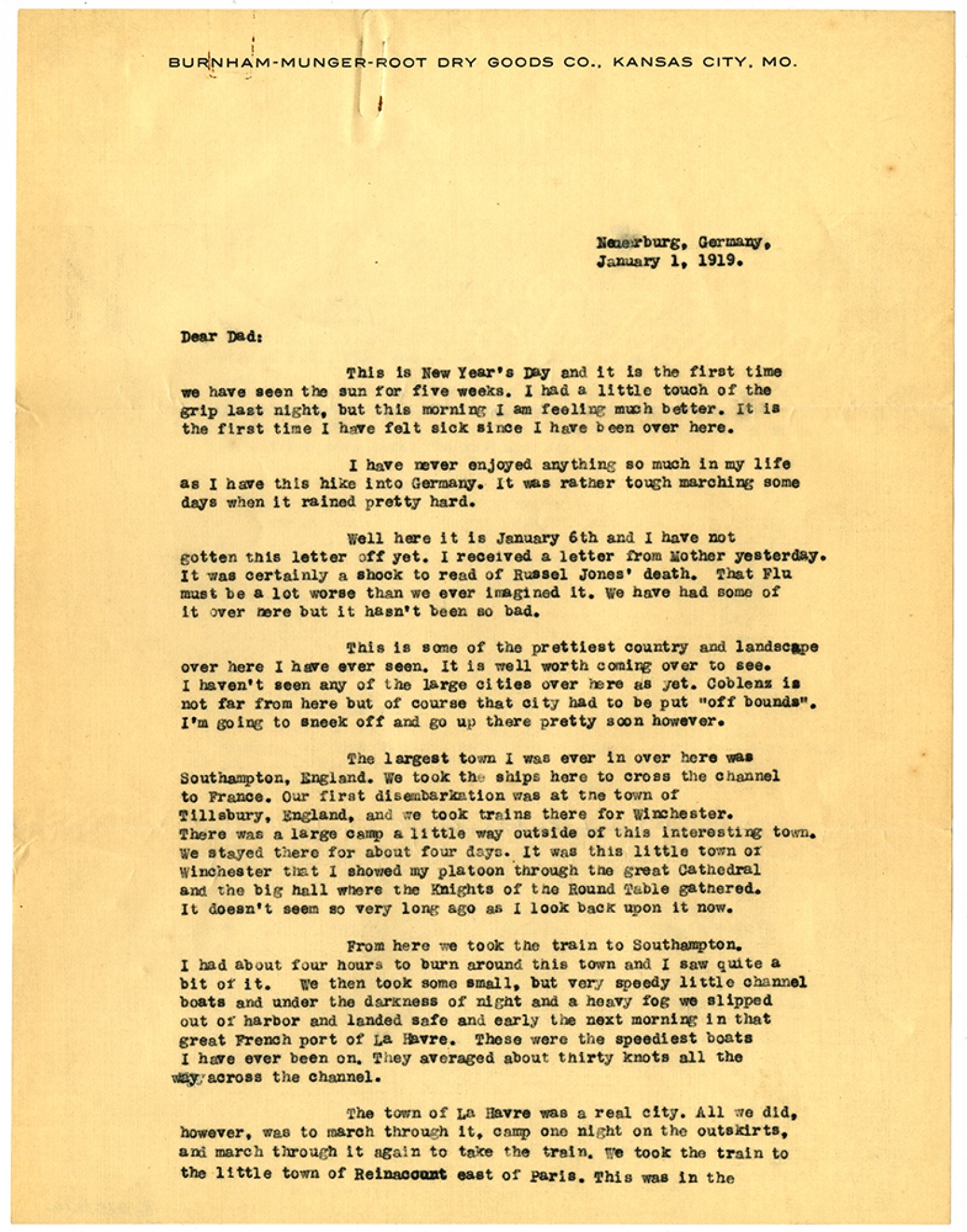 Neuerberg, Germany, January 1, 1919. Dear Dad: This is New Year’s Day and it is the first time we have seen the sun for five weeks. I had a little touch of the grip last night, but this morning I am feeling much better. It is the first time I have felt sick since I have been over here. I have never enjoyed anything so much in my life as I have this hike into Germany. It was rather tough marching some days when it rained pretty hard. Well here it is January 6th and I have not gotten this letter off yet. I received a letter from Mother yesterday. It was certainly a shock to read of Russel Jones’ death. That Flu must be a lot worse than we ever imagined it. We have had some of it over here but it hasn’t been so bad. This is some of the prettiest country and landscape over here I have ever seen. It is well worth coming over to see. I haven’t seen any of the large cities over here as yet. Coblenz is not far from here but of course that city had to be put “off bounds”. I’m going to sneek off and go up there pretty soon however. The largest town I was ever in over here was Southampton, England. We took the ships here to cross the channel to France. Our first disembarkation was at the town of Tillsbury, England, and we took trains there for Winchester. There was a large camp a little way outside of this interesting town. We stayed there for about four days. It was this little town of Winchester that I showed my platoon through the great Cathedral and the big hall where the Knights of the Round Table gathered. It doesn’t seem so very long ago as I look back upon it now. From here we took the train to Southampton. I had about four hours to burn around this town and I saw quite a bit of it. We then took some small, but very speedy little channel boats and under the darkness of night and a heavy fog we slipped out of harbor and landed safe and early the next morning in that great French port of La Havre. These were the speediest boats I have ever been on. They averaged about thirty knots all the way across the channel. The town of La Havre was a real city. All we did, however, was to march through it, camp one night on the outskirts, and march through it again to take the train. We took the train to the little town of Reinacourt east of Paris. This was in the