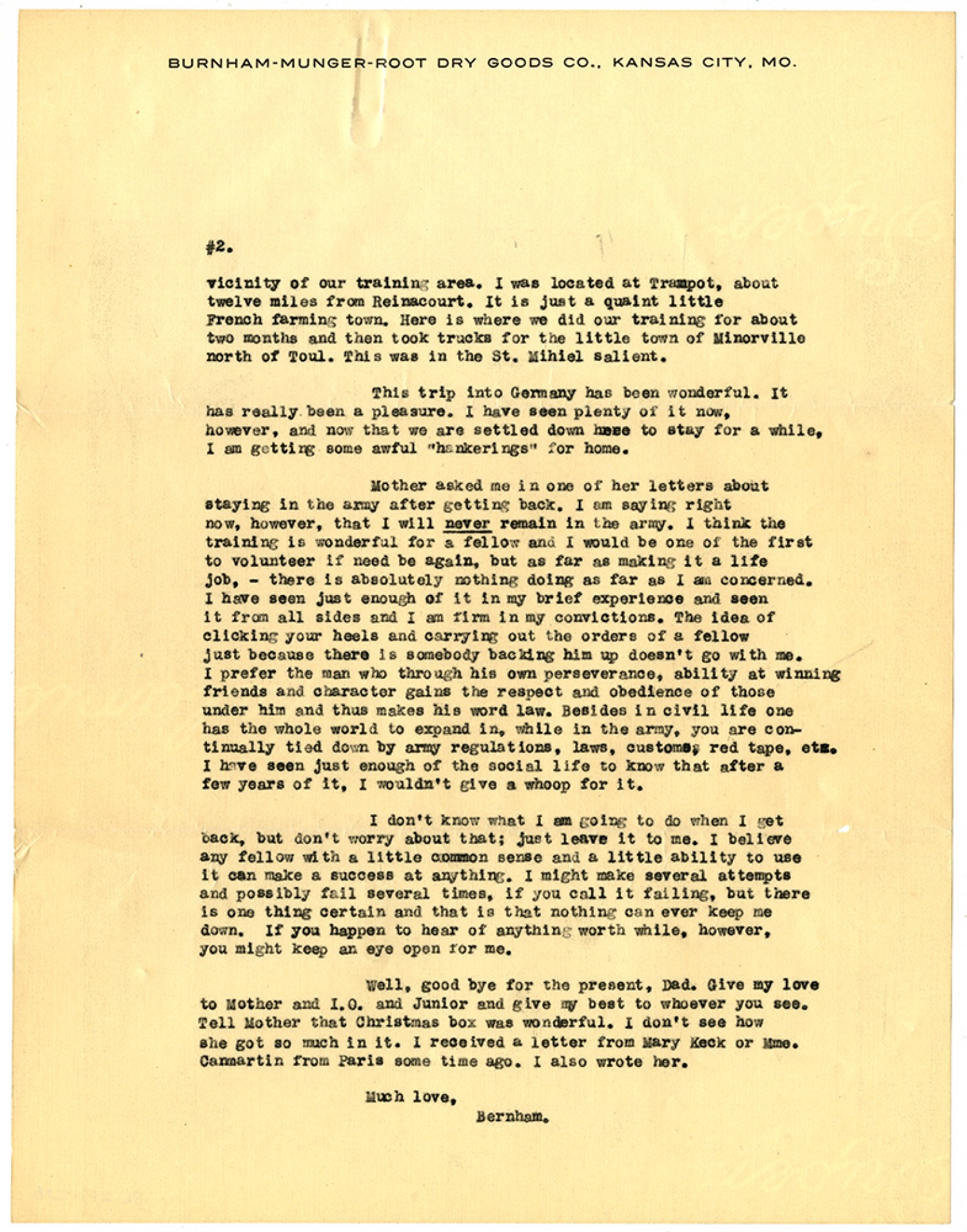 [page 2] vicinity of our training area. I was located at Trampot, about twelve miles from Reinacourt. It is just a quaint little French farming town. Here is where we did our training for about two months and then took trucks for the little town of Minorville north of Toul. This was in the St. Mihiel Salient. This trip into Germany has been wonderful. It has really been a pleasure. I have seen plenty of it now, however, and now that we are settled down here to stay for a while, I am getting some awful “hankerings” for home. Mother asked me in one of her letters about staying in the army after getting back. I am saying right now, however, that I will never remain in the army. I think the training is wonderful for a fellow and I would be one of the first to volunteer if need be again, but as far as making it a life job, - there is absolutely nothing doing as far as I am concerned. I have seen just enough of it in my brief experience and seen it from all sides and I am firm in my convictions. The idea of clicking your heels and carrying out the orders of a fellow just because there is somebody backing him up doesn’t go with me. I prefer the man who through his own perseverance, ability at winning friends and character gains the respect and obedience of those under him and thus makes his word law. Besides in civil life one has the whole world to expand in, while in the army, you are continually tied down by army regulations, laws, customs, red tape, etc. I have seen just enough of the social life to know that after a few years of it, I wouldn’t give a whoop for it. I don’t know what I am going to do when I get back, but don’t worry about that; just leave it to me. I believe any fellow with a little common sense and a little ability to use it can make a success at anything. I might make several attempts and possibly fail several times, if you call it failing, but there is one thing certain and that is that nothing can ever keep me down. If you happen to hear of anything worth while, however, you might keep an eye open for me. Well, good bye for the present, Dad. Give my love to Mother and I.O. and Junior and give my best to whoever you see. Tell Mother that Christmas box was wonderful. I don’t see how she got so much in it. I received a letter from Mary Keck or Mme. Canmartin from Paris some time ago. I also wrote her. Much love, Burnham.