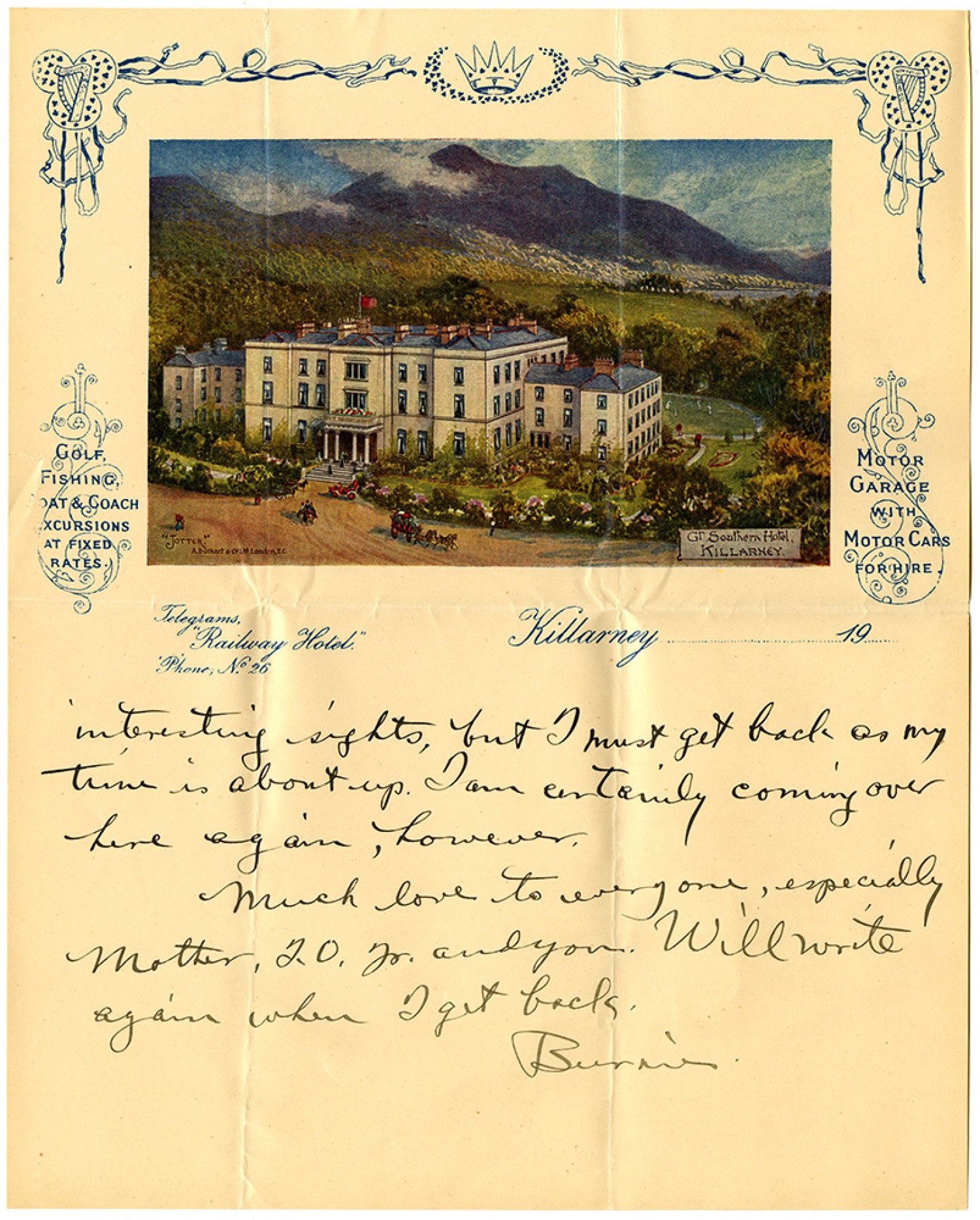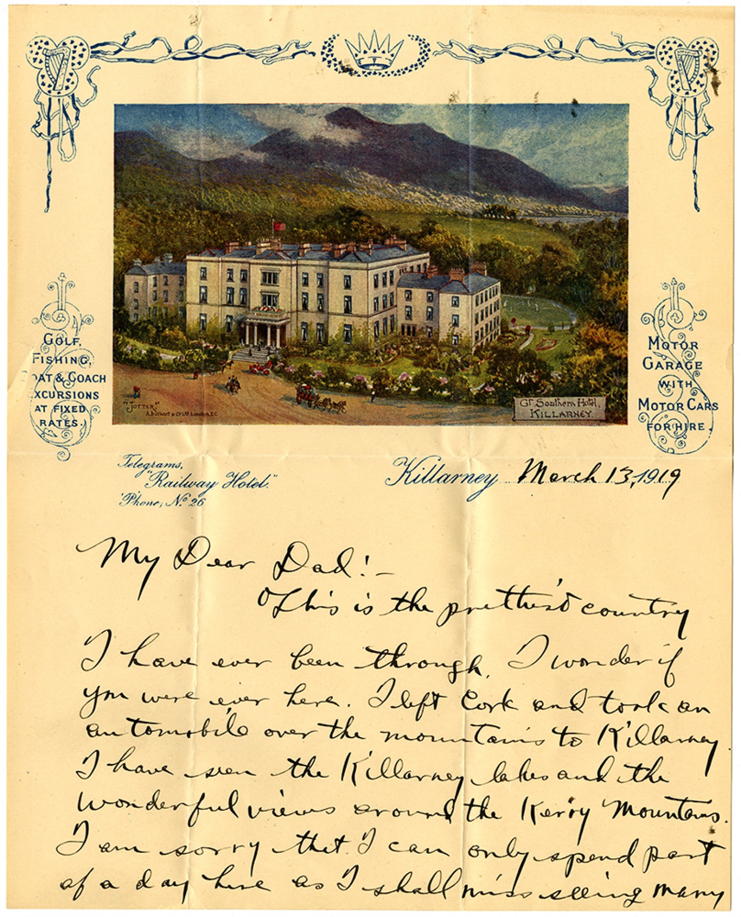 Killarney March 13, 1919 My Dear Dad: - This is the prettiest country I have ever been through. I wonder if you were ever here. I left Cork and took an automobile over the mountains to Killarney. I have seen the Killarney lakes and the wonderful views around the Kerry Mountains. I am sorry that I can only spend part of a day here as I shall miss seeing many