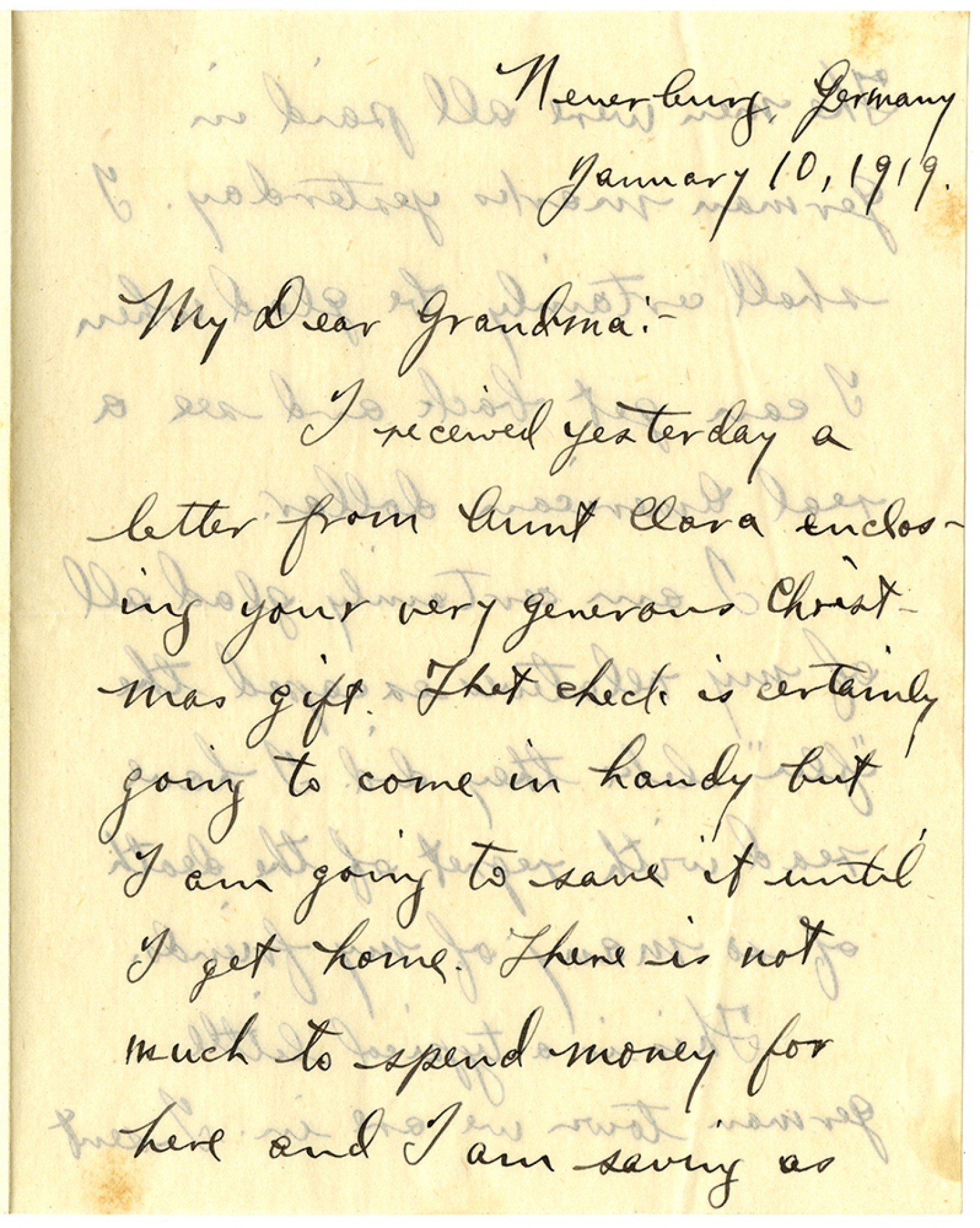 Neuerburg, Germany January 10, 1919. My Dear Grandma:- I received yesterday a letter from Aunt Clara enclosing your very generous Christmas gift. That check is certainly going to come in handy but I am going to save it until I get home. There is not much to spend money for here and I am saving as