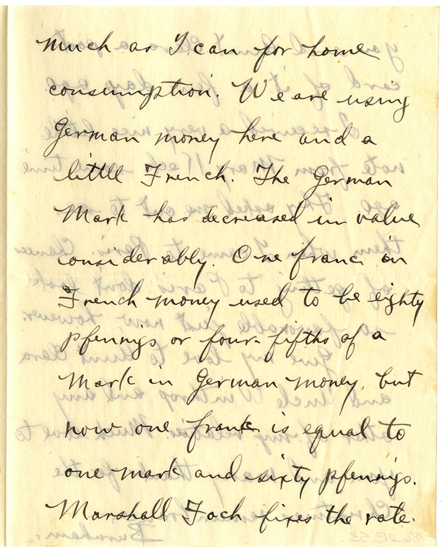 much as I can for home consumption. We are using German money here and a little French. The German Mark has decreased in value considerably. One franc in French money used to be eighty pfennigs or four-fifths of a mark in German money, but now one franc is equal to one mark and sixty pfennigs. Marshall Foch fixes the rate.