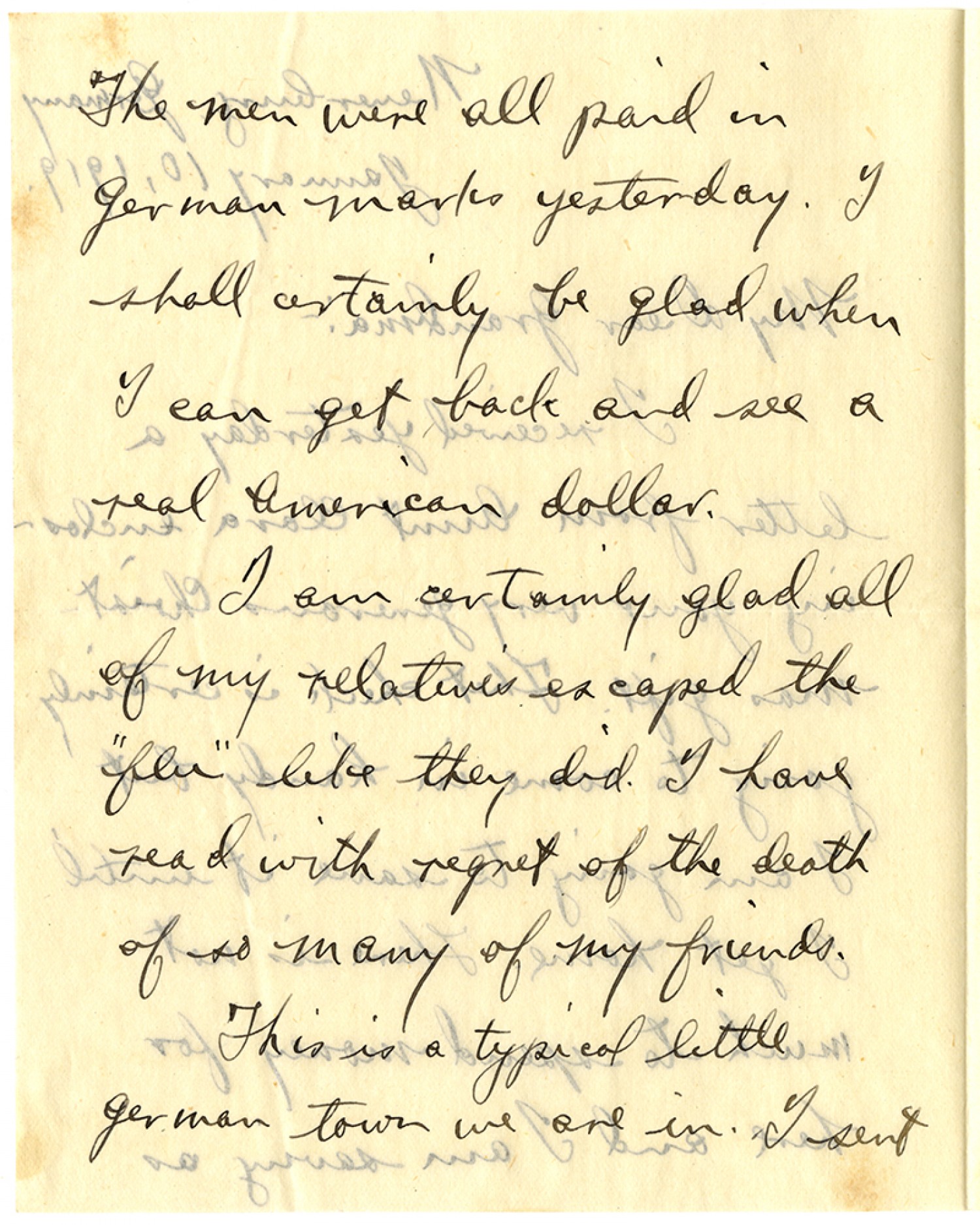 The men were all paid in German marks yesterday. I shall certainly be glad when I can get back and see a real American dollar. I am certainly glad all of my relatives escaped the “flu” like they did. I have read with regret of the death of so many of my friends. This is a typical little German town we are in. I sent