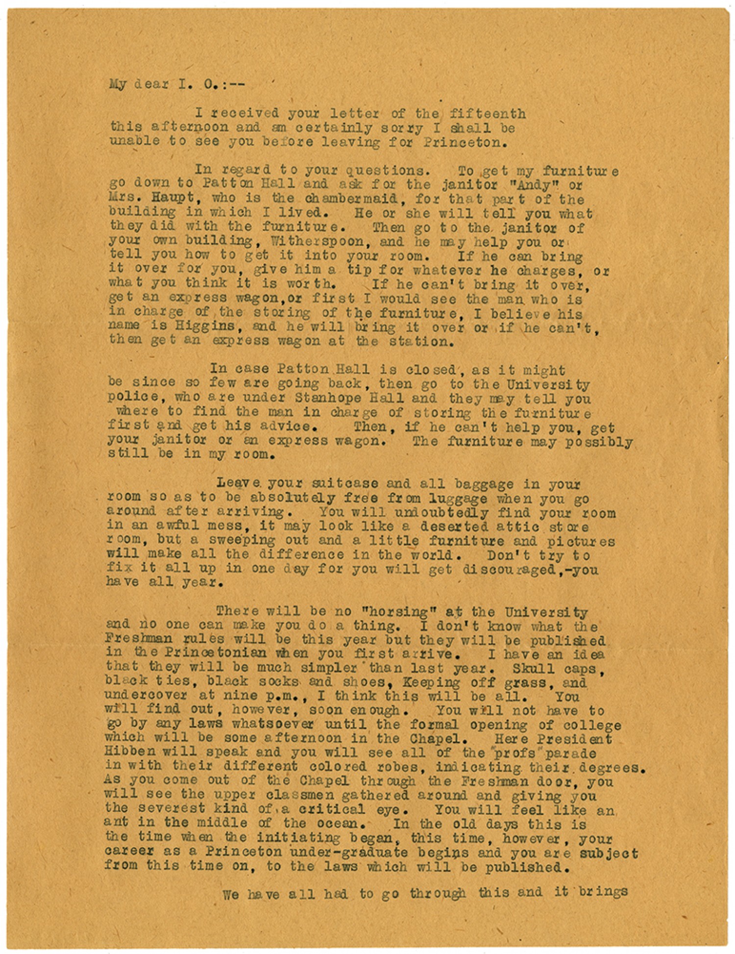 My dear I.O. : -- I received your letter of the fifteenth this afternoon and am certainly sorry I shall be unable to see you before leaving for Princeton. In regard to your questions. To get my furniture go down to Patton Hall and ask for the janitor “Andy” or Mrs. Haupt, who is the chambermaid, for that part of the building in which I lived. He or she will tell you what they did with the furniture. Then go to the janitor of your own building, Witherspoon, and he may help you or tell you how to get it into your room. If he can bring it over for you, give him a tip for whatever he charges, or what you think it is worth. If he can’t bring it over, get an express wagon, or first I would see the man who is in charge of the storing of the furniture, I believe his name is Higgins, and he will bring it over or if he can’t, then get an express wagon at the station. In case Patton Hall is closed, as it might be since so few are going back, then go to the University police, who are under Stanhope Hall and they may tell you where to find the man in charge of storing the furniture first and get his advice. Then, if he can’t help you, get your janitor or an express wagon. The furniture may possibly still be in my room. Leave your suitcase and all baggage in your room so as to be absolutely free from luggage when you go around after arriving. You will undoubtedly find your room in an awful mess, it may look like a deserted attic store room, but a sweeping out and a little furniture and pictures will make all the difference in the world. Don’t try to fix it all up in one day for you will get discouraged, - you have all year. There will be no “horsing” at the University and no one can make you do a thing. I don’t know what the Freshman rules will be this year but they will be published in the Princetonian when you first arrive. I have an idea that they will be much simpler than last year. Skull caps, black ties, black socks and shoes, Keeping off grass, and undercover at nine p.m., I think this will be all. You will find out, however, soon enough. You will not have to go by any laws whatsoever until the formal opening of college which will be some afternoon in the Chapel. Here President Hibben will speak and you will see all of the “profs” parade in with their different colored robes, indicating their degrees. As you come out of the Chapel through the Freshman door, you will see the upper classmen gathered around and giving you the severest kind of a critical eye. You will feel like an ant in the middle of the ocean. In the old days this is the time when the initiating began, this time, however, your career as a Princeton under-graduate begins and you are subject from this time on, to the laws which will be published. We have all had to go through this and it brings