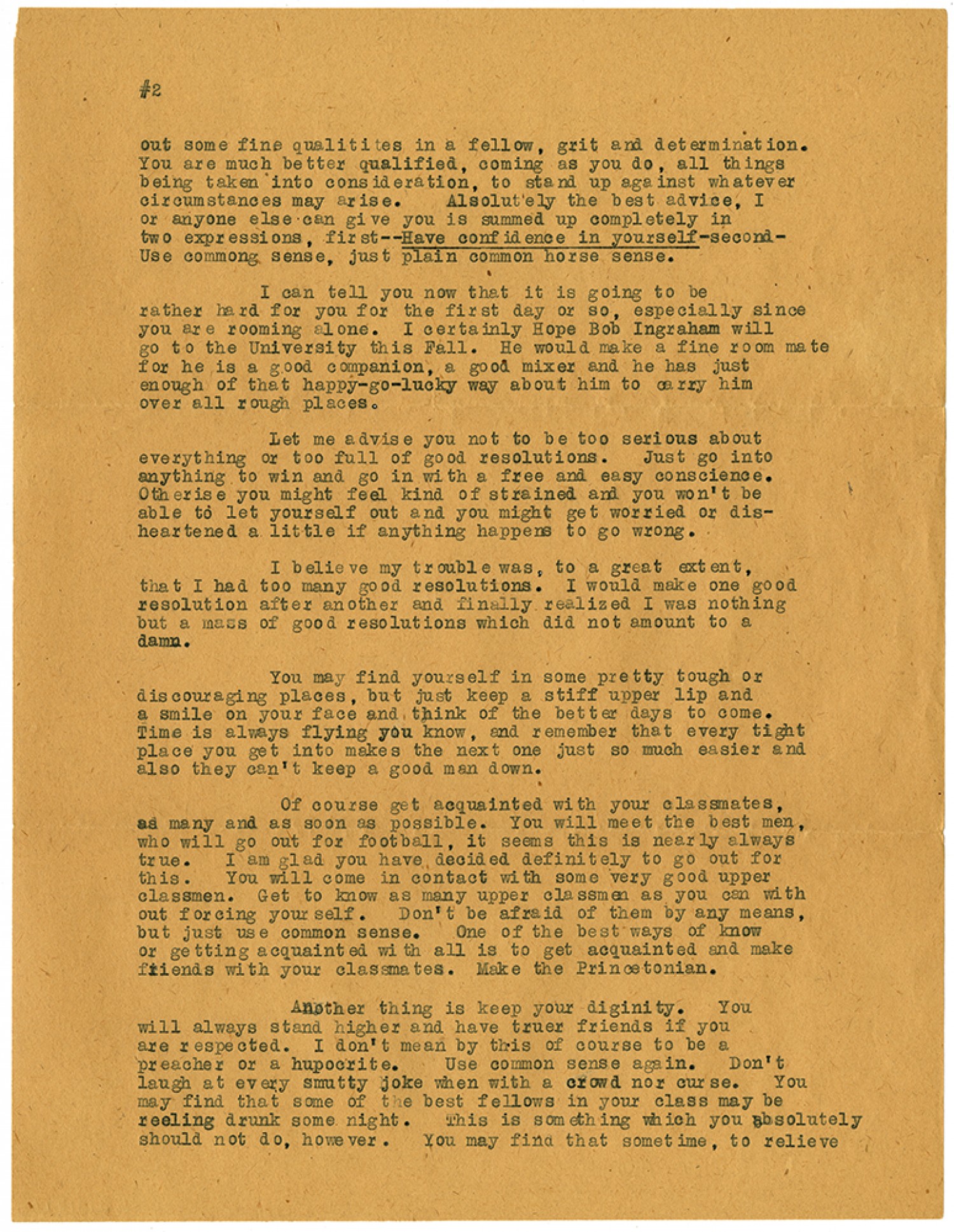 [Page #2] out some fine qualities in a fellow, grit and determination. You are much better qualified, coming as you do, all things being taken in to consideration, to stand up against whatever circumstances may arise. Absolutely the best advice, I or anyone else can give you is summed up completely in two expressions, first--Have confidence in yourself-second-use common sense, just plain common horse sense. I can tell you now that it is going to be rather hard for you for the first day or so, especially since you are rooming alone. I certainly Hope Bob Ingraham will go to the University this Fall. He would make a fine room mate for he is a good companion, a good mixer and he has just enough of that happy-go-lucky way about him to carry him over all rough places. Let me advise you not to be too serious about everything or too full of good resolutions. Just go into anything to win and go in with a free and easy conscience. Otherwise you might feel kind of strained and you won’t be able to let yourself out and you might get worried or dis-heartened a little if anything happens to go wrong. I believe my trouble was, to a great extent, that I had too many good resolutions. I would make one good resolution after another and finally realized I was nothing but a mass of good resolutions which did not amount to a damn. You may find yourself in some pretty tough or discouraging places, but just keep a stiff upper lip and a smile on your face and think of the better days to come. Time is always flying you know, and remember that every tight place you get into makes the next one just so much easier and also they can’t keep a good man down. Of course get acquainted with your classmates, as many and as soon as possible. You will meet the best men, who will go out for football, it seems this is nearly always true. I am glad you have decided definitely to go out for this. You will come in contact with some very good upper classmen. Get to know as many upper classmen as you can with out forcing yourself. Don’t be afraid of them by any means, but just use common sense. One of the best ways of know or getting acquainted with all is to get acquainted and make friends with your classmates. Make the Princetonian. Another thing is keep your dignity. You will always stand higher and have truer friends if you are respected. I don’t mean by this of course to be a preacher or a hupocrite. Use common sense again. Don’t laugh at every smutty joke when with a crowd nor curse. You may find that some of the best fellows in your class may be reeling drunk some night. This is something which you absolutely should not do, however. You may find that sometime, to relieve