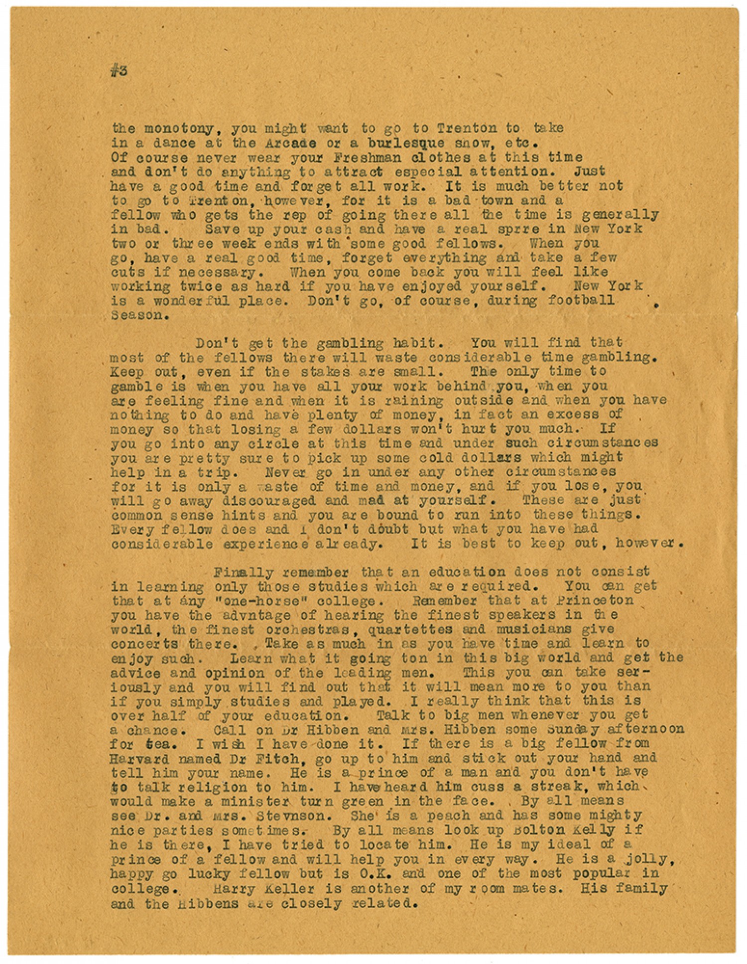 [Page #3] the monotony, you might want to go to Trenton to take in a dance at the Arcade or a burlesque show, etc. Of course never wear your Freshman clothes at this time and don’t do anything to attract especial attention. Just have good time and forget all work. It is much better not to go to Trenton, however, for it is a bad town and a fellow who gets the rep of going there all the time is generally in bad. Save up your cash and have a real sprre in New York two or three week ends with some good fellows. When you go, have a real good time, forget everything and take a few cuts if necessary. When you come back you will feel like working hard twice as hard if you have enjoyed yourself. New York is a wonderful place. Don’t go, of course, during football season. Don’t get the gambling habit. You will find that most of the fellows there will waste considerable time gambling. Keep out, even if the stakes are small. The only time to gamble is when you have all your work behind you, when you are feeling fine and when it is raining outside and when you have nothing to do and have plenty of money, in fact an excess of money so that losing a few dollars won’t hurt you much. If you go into any circle at this time and under such circumstances you are pretty sure to pick up some cold dollars which might help in a trip. Never go in under any other circumstances for it is only a waste of time and money, and if you lose, you will go away discouraged and mad at yourself. These are just common sense hints and you are bound to run into these things. Every fellow does and I don’t doubt but what you have had considerable experience already. It is best to keep out, however. Finally remember that an education does not consist in learning only those studies which are required. You can get that at any “one-horse” college. Remember that at Princeton you have the advantage of hearing the finest speakers in the world, the finest orchestras, quartettes and musicians give concerts there. Take as much in as you have time and learn to enjoy such. Learn what it going ton in this beg world and get the advice and opinion of the leading men. This you can take seriously and you will find out that it will mean more to you than if you simply studies and played. I really think that this is over half of your education. Talk to beg men whenever you get a chance. Call on Dr. Hibben and Mrs. Hibben some Sunday afternoon for tea. I wish I have done it. If there is a big fellow from Harvard named Dr. Fitch, go up to him and stick out your hand and tell him your name. He is a prince of a man and you don’t have to talk religion to him. I have heard him cuss a streak, which would make a minister turn green in the face. By all means see Dr. and Mrs. Stevnson. She is a peach and has some mighty nice parties sometimes. By all means look up Bolton Kelly if he is there, I have tried to locate him. He is my ideal of a prince of a fellow and will help you in every way. He is a jolly, happy go lucky fellow but is O.K. and one of the most popular in college. Harry Keller is another of my room mates. His family and the Hibbens are closely related.