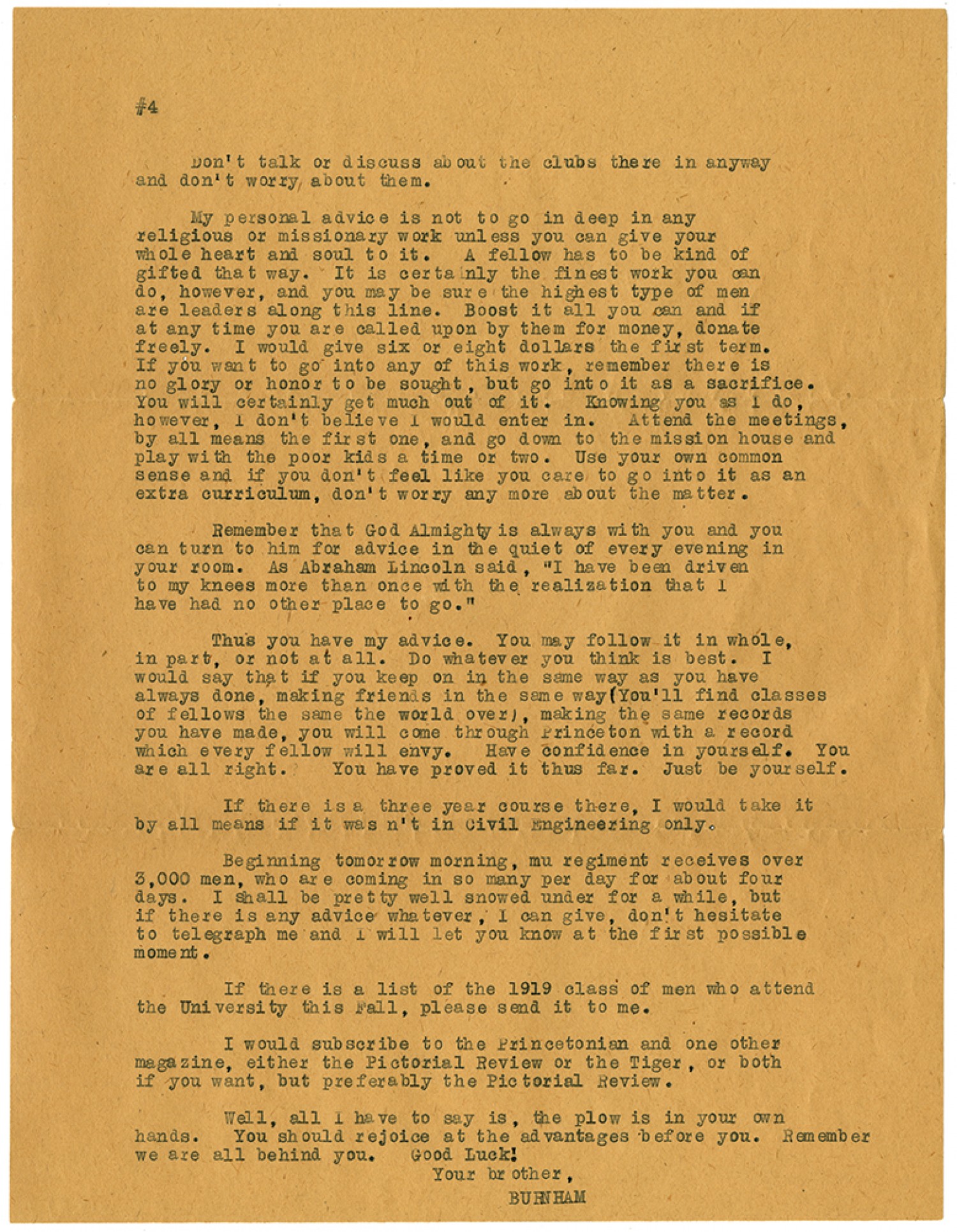[Page #4] Don’t talk or discuss about the clubs there in anyway and don’t worry about them. My personal advice is not to go in deep in any religious or missionary work unless you can give your whole heart and soul to it. A fellow has to be kind of gifted that way. It is certainly the finest work you can do, however, and you may be sure the highest type of men are leaders along this line. Boost it all you can and if at any time you are called upon by them for money, donate freely. I would give six or eight dollars the first term. If you want to go into any of this work, remember there is no glory or honor to be sought, but go into it as a sacrifice. You will certainly get much out of it. Knowing you as I do, however, I don’t believe I would enter in. Attend the meetings, by all means the first one, and go down to the mission house and play with the poor kids a time or two. Use your own common sense and if you don’t feel like you care to go into it as an extra curriculum, don’t worry any more about the matter. Remember that God Almighty is always with you and you can turn to him for advice in the quiet of every evening in your room. As Abraham Lincoln said, “I have been driven to my knees more than once with the realization that I have no other place to go.” Thus you have my advice. You may follow it in whole, in part, or not at all. Do whatever you think is best. I would say that if you keep on in the same way as you have always done, making friends in the same way (You’ll find classes of fellows the same world over), making the same records you have made, you will come through Princeton with a record which every fellow will envy. Have confidence in yourself. You are all right. You have proved it thus far. Just be yourself. If there is a three year course over there, I would take it by all means if it wasn’t in Civil Engineering only. Beginning tomorrow morning, mu regiment receives over 3,000 men, who are coming in so many per day for about four days. I shall be pretty well snowed under for a while, but if there is any advice whatever, I can give, don’t hesitate to telegraph me and I will let you know at the first possible moment. If there is a list of the 1919 class of men who attend the University this Fall, please send it to me. I would subscribe to the Princetonian and one other magazine, either the Pictorial Review or the Tiger, or both if you want, but preferable the Pictorial Review. Well, all I have to say is, the plow is in your own hands. You should rejoice at the advantages before you. Remember we are all behind you. Good Luck! Your brother, BURNHAM