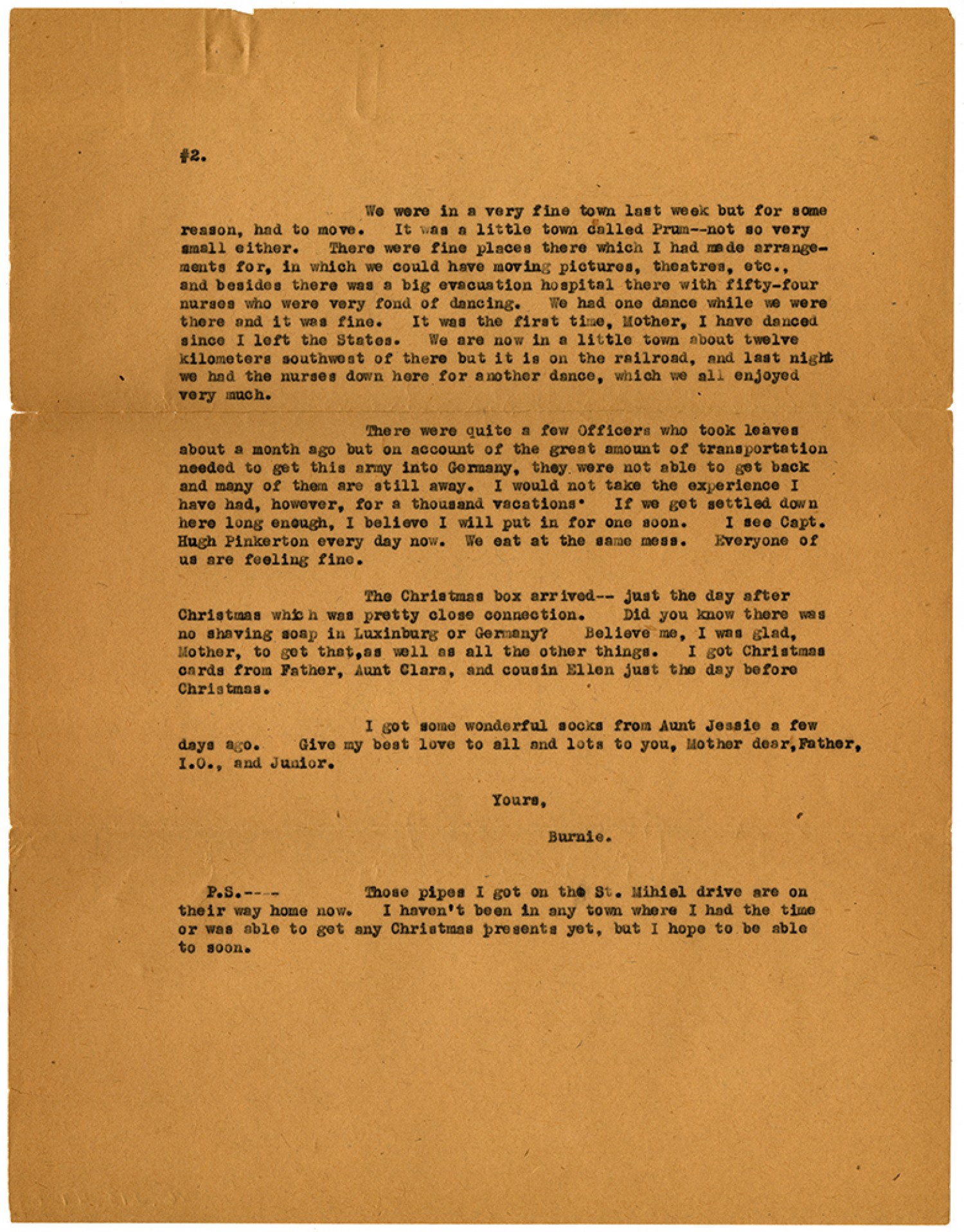 [page #2] We were in a very fine town last week but for some reason, had to move. It was a little town called Prum--not so very small either. There were fine places there which I had made arrangements for, in which we could have moving pictures, theatres, etc., and besides there was a big evacuation hospital there with fifty-four nurses who were very fond of dancing. We had one dance while we were there and it was fine. It was the first time, Mother, I have danced since I left the States. We are now in a little town about twelve kilometers southwest of there but it is on the railroad, and last night we had the nurses down here for another dance, which we all enjoyed very much. There were quite a few Officers who took leaves about a month ago but on account of the great amount of transportation needed to get this army into Germany, they were not able to get back and many of them are still away. I would not take the experience I have a had, however, for a thousand vacations. If we get settled down here long enough, I believe I will put in for one soon. I see Capt. Hugh Pinkerton every day now. We eat at the same mess. Everyone of us are feeling fine. The Christmas box arrived--just the day after Christmas which was pretty close connection. Did you know there was no shaving soap in Luxinburg or Germany? Believe me, I was glad, Mother, to get that, as well as all the other things. I got Christmas cards from Father, Aunt Clara, and cousin Ellen just the day before Christmas. I got some wonderful socks from Aunt Jessie a few days ago. Give my best love to all and lots to you, Mother dear, Father, I.O., and Junior. Yours, Burnie. P.S.- Those pipes I got on the St. Mihiel drive are on their way home now. I haven't been in any town where I had the time or was able to get any Christmas presents yet, but I hope you be able to soon.