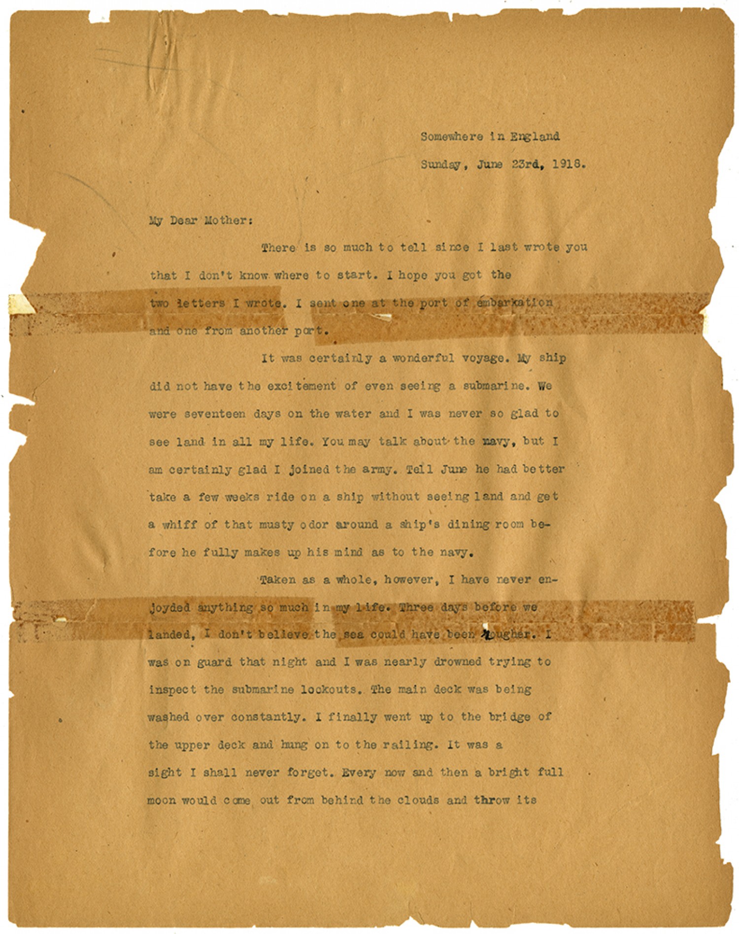 Somewhere in England Sunday, June 23rd, 1918. My Dear Mother: There is so much to tell since I last wrote you that I don’t know where to start. I hope you got the two letters I wrote. I sent one at the port of embarkation and one from another port. It was certainly a wonderful voyage. My ship did not have the excitement of even seeing a submarine. We were seventeen days on the water and I was never so glad to see land in all my life. You may talk about the navy, but I am certainly glad I joined the army. Tell June he had better take a few weeks ride on a ship without seeing land and get a whiff of that musty odor around a ship’s dining room before he fully makes up his mind as to the navy. Taken as a whole, however, I have never enjoyed anything so much in my life. Three days before we landed, I don’t believe the sea could have been rougher. I was on guard that night and I was nearly drowned trying to inspect the submarine lookouts. The main deck was being washed over constantly. I finally went up to the bridge of the upper deck and hung on to the railing. It was a sight I shall never forget. Every now and then a bright full moon would come out from behind the clouds and throw its