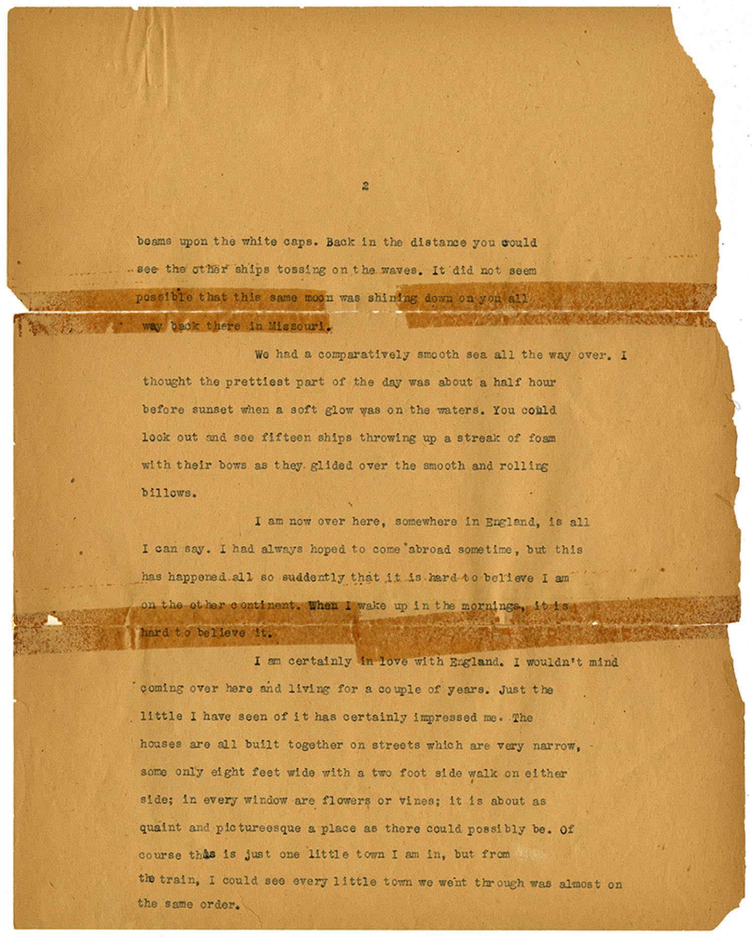 [Page 2] beams upon the white caps. Back in the distance you could see the other ships tossing on the waves. It did not seem possible that this same moon was shining down on you all way back there in Missouri. We had a comparatively smooth sea all the way over. I thought the prettiest part of the day was about a half hour before sunset when a soft glow was on the waters. You could look out and see fifteen ships throwing up a streak of foam with their bows as they glided over the smooth and rolling billows. I am now over here, somewhere in England, is all I can say. I had always hoped to come abroad sometime, but this has happened all so suddently that it is hard to believe I am on the other continent. When I wake up in the mornings, it is hard to believe it. I am certainly in love with England. I wouldn’t mind coming over here and living for a couple years. Just the little I have seen of it has certainly impressed me. The houses are all built together on streets which are very narrow, some only eight feet wide with a two foot side walk on either side; in every window are flowers or vines; it is about as quaint and picturesque a place as there could possibly be. Of course this is just one little town I am in, but from the train, I could see every little town we went through was almost on the same order.