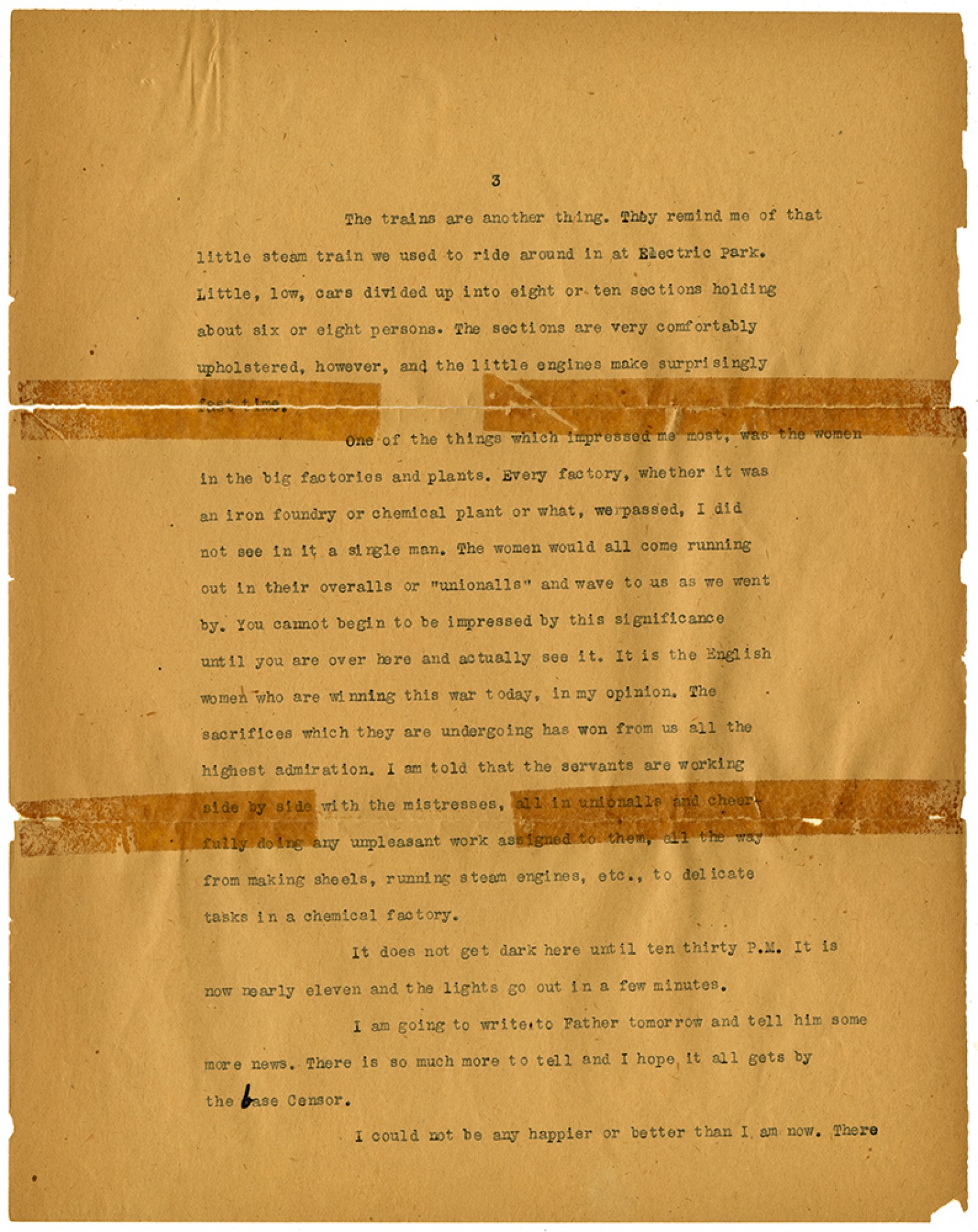 [Page 3] The trains are another thing. They remind me of that little steam train we used to ride around in at Electric Park. Little, low, cars divided up into eight or ten sections holding about six or eight persons. The sections are very comfortably upholstered, however, and the little engines make surprisingly fast time. One of the things which impressed me most, was the women in the big factories and plants. Every factory, whether it was an iron foundry or chemical plant or what, we passed, I did not see in it one single man. The women all would come running out in their overalls or “unionalls” and wave to us as we went by. You cannot begin to be impressed by this significance until you are over here and actually see it. It is the English women who are winning this war today, in my opinion. The sacrifices which they are undergoing has won from us all the highest admiration. I am told that the servants are working side by side with the mistresses, all in unionalls and cheerfully doing any unpleasant work assigned to them, all the way from making sheels, running steam engines, etc., to delicate tasks in a chemical factory. It does not get dark here until ten thirty P.M. It is now nearly eleven and the lights go out in a few minutes. I am going to write to Father tomorrow and tell him some more news. There is so much more to tell and I hope it all gets by the base Censor. I could not be any happier or better than I am now. There