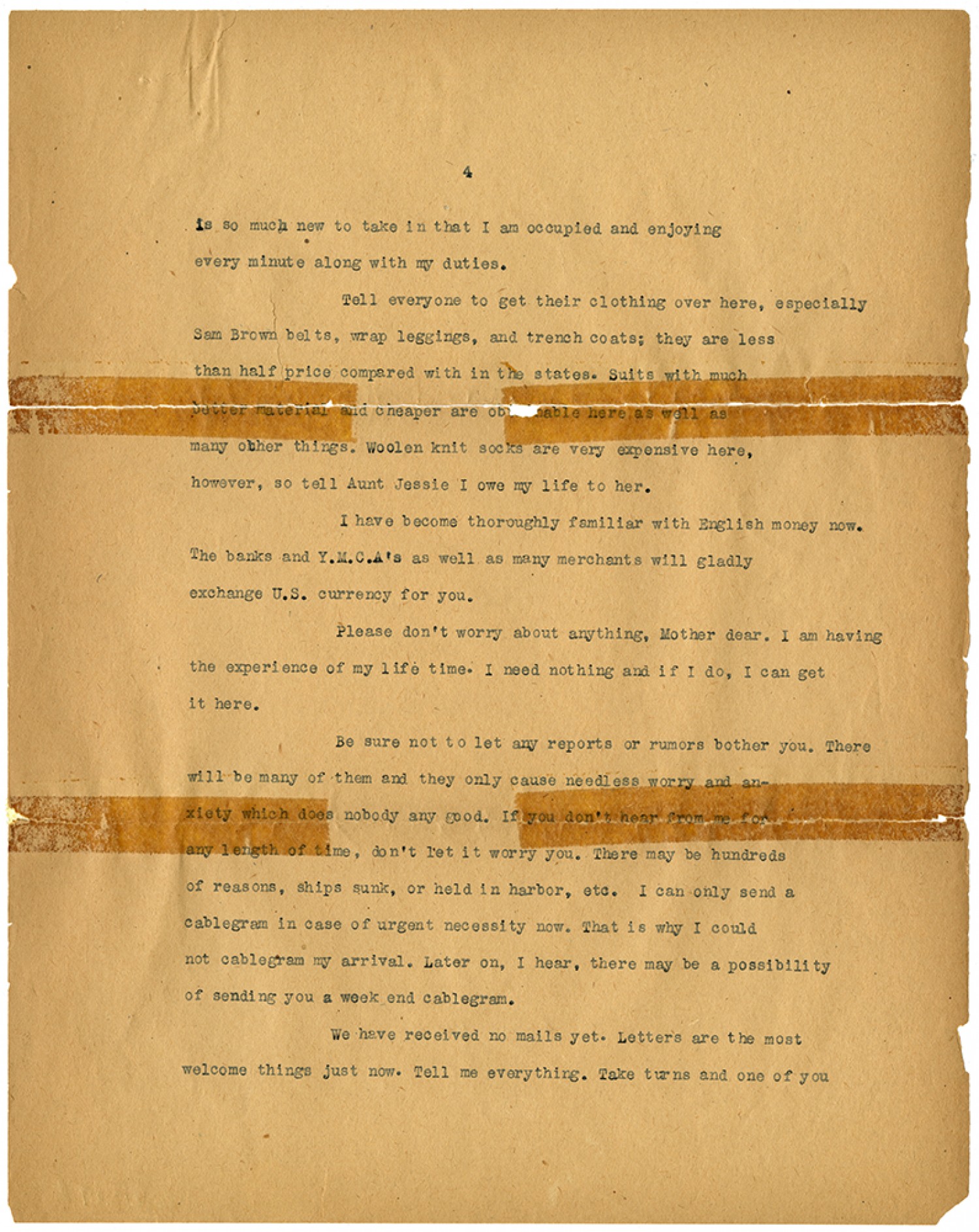 [Page 4] is so much new to take in that I am occupied and enjoying every minute along with my duties. Tell everyone to get their clothing over here, especially Sam Brown belts, wrap leggings, and trench coats; they are less than half price compared with in the states. Suits with much better material and cheaper are [obtainable] here as well as many other things. Woolen knit socks are very expensive here, however, so tell Aunt Jessie I owe my life to her. I have become thoroughly familiar with English money now. The banks and Y.M.C.A.’s as well as many merchants will gladly exchange U.S. currency for you. Please don’t worry about anything, Mother dear. I am having the experience of my life time. I need nothing and if I do, I can get it here. Be sure not to let any reports or rumors bother you. There will be many of them and they only cause needless worry and anxiety which does nobody any good. If you don’t hear from me for any length of time, don’t let it worry you. There may be hundreds of reasons, ships sunk, or held in harbor, etc. I can only send a cablegram in case of urgent necessity now. That is why I could not cablegram my arrival. Later on, I hear, there may be a possibility of sending you a week end cablegram. We have received no mails yet. Letters are the most welcome things just now. Tell me everything. Take turns and one of you