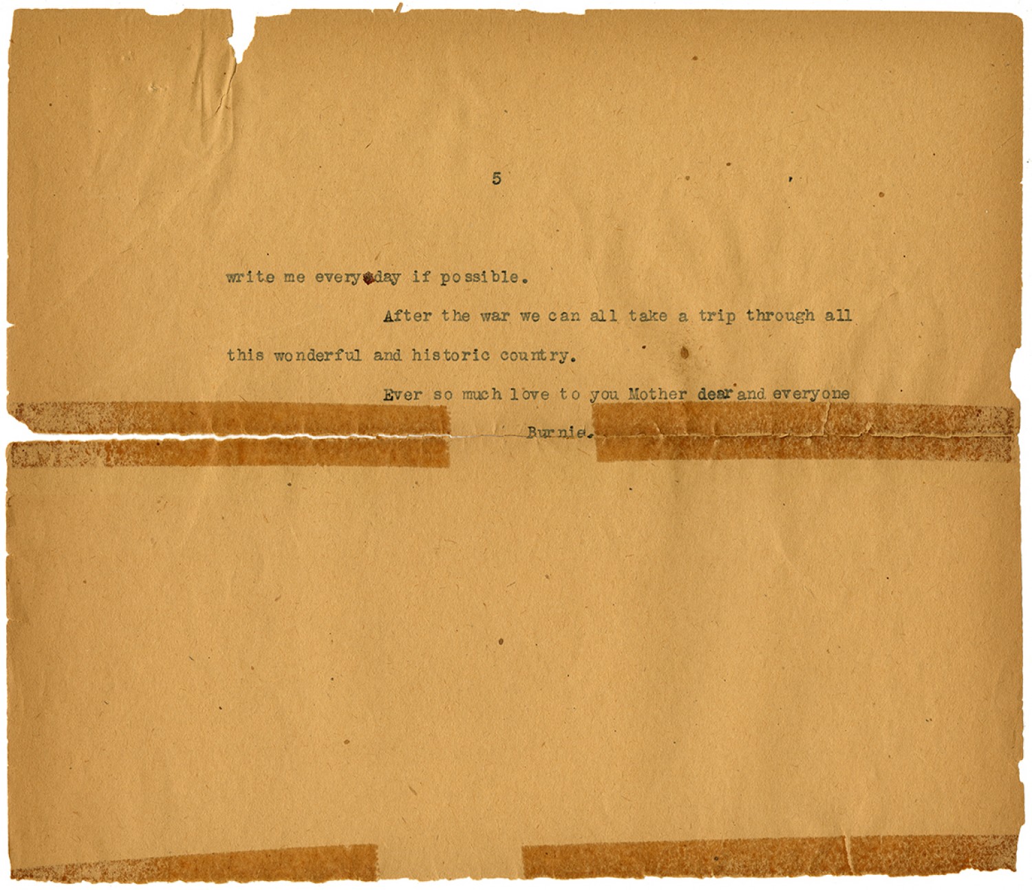 [Page 5] write to me every day if possible. After the war we can all take a trip through all this wonderful and historic country. Ever so much love to you Mother dear and everyone Burnie.