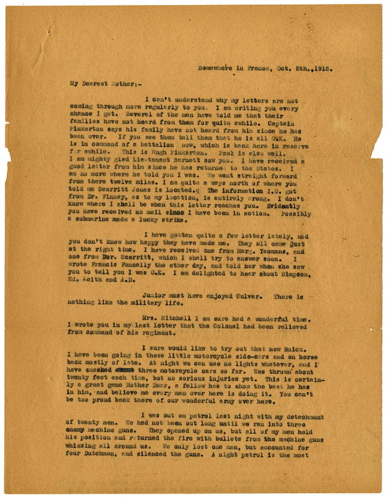 Somewhere in France, Oct. 5th., 1918. My Dearest Mother:- I can’t understand why my letters are not coming through more regularly to you. I am writing you every chance I get. Several of the men have told me that their families have not heard from them for quite awhile. Captain Pinkerton says his family have not heard from him since he has been over. If you see them tell them that he is all O.K. He is in command of a battalion now, which is back here in reserve for awhile. This is Hugh Pinkerton. Paul is also well. I am mighty glad Lieutenant Barnett saw you. I have received a good letter from him since he has returned to the States. I am no more where he told you I was. We went straight forward from there twelve miles. I am quite a ways north of where you told me Scarritt Jones is located. The information I.O. got from Dr. Finney, as to my location, is entirely wrong. I don’t know where I shall be when this letter reaches you. Evidently you have received no mail since I have been in action. Possibly a submarine made a lucky strike. I have gotten quite a few letter lately, and you don’t know how happy they have made me. They all came just at the right time. I have received one from Marg. Yeomans, and one from Dor. Scarritt, which I shall try to answer soon. I wrote Francis Fennelly the other day, and told her when she saw you to tell you I was O.K. I am delighted to hear about Simpson, Ed. Keith and A.D. Junior must have enjoyed Culver. There is nothing like the military life. Mrs. Mitchell I am sure had a wonderful time. I wrote you in my last letter that the Colonel had been relieved from command of his regiment. I sure would like to try out that new Buick. I have been going in these little motorcycle side-cars and on horse back mostly of late. At night we can use no lights whatever, and I have smashed three motorcycle cars so far. Was thrown about twenty feet each time, but no serious injuries yet. This is certainly a great game Mother Dear, a fellow has to show the best he has in him, and believe me every man over here is doing it. You can’t be too proud back there of our wonderful army over here. I was out on patrol last night with my detachment of twenty men. We had not been out long until we ran into three enemy machine guns. They opened up on us, but all of my men held his position and returned the fire with bullets from the machine guns whizzing all around us. We only lost one man, but accounted for four Dutchmen, and silenced the guns. A night patrol is the most