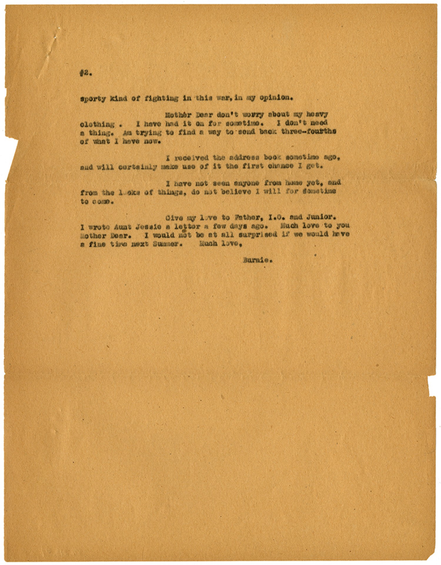 [page 2] sporty kind of fighting in this war, in my opinion. Mother Dear don’t worry about my heavy clothing. I have had it on for sometime. I don’t need a thing. Am trying to find a way to send back three-fourths of what I have now. I received the address book sometime ago, and will certainly make use of it the first chance I get. I have not seen anyone from home yet, and from the looks of things, do not believe I will for sometime to come. Give my love to Father, I.O. and Junior. I wrote Aunt Jessie a letter a few days ago. Much love to you Mother Dear. I would not be at all surprised if we would have a fine time next Summer. Much love, Burnie.