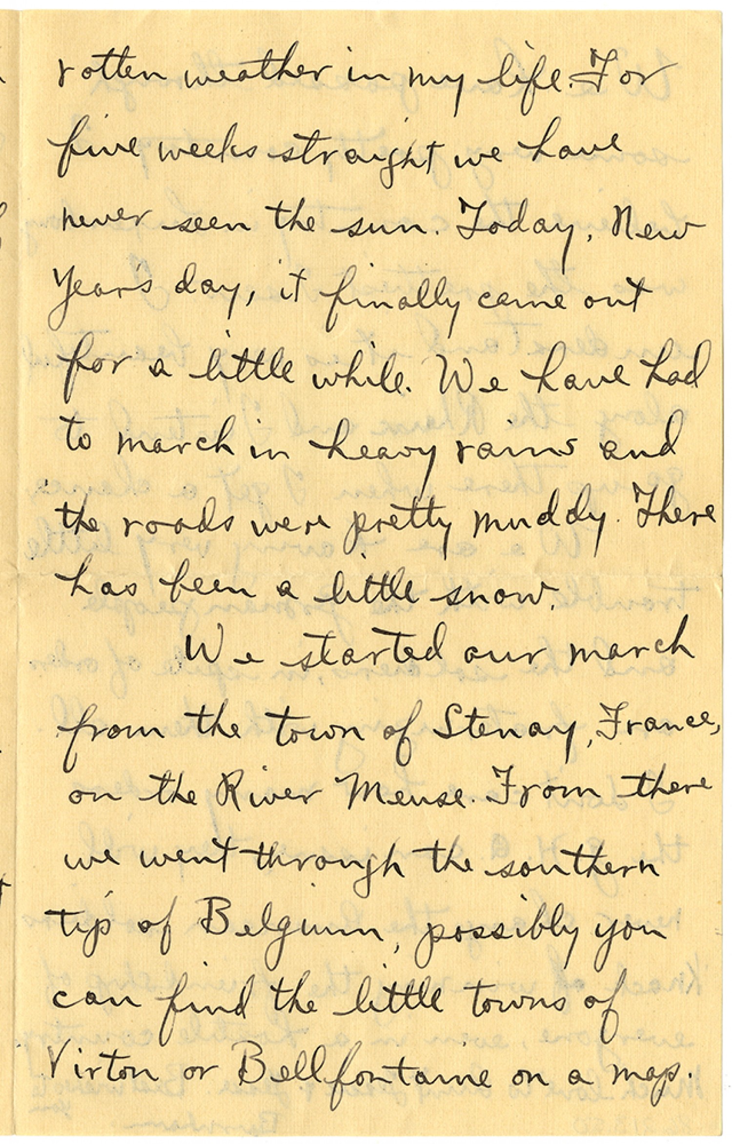 rotten weather in my life. For five weeks straight we have never seen the sun. Today, New Year’s day, it finally came out for a little while. We have had to march in heavy rains and the roads were pretty muddy. There has been a little snow. We started our march from the town of Stenay, France, on the River Meuse. From there we went through the southern tip of Belgium, possibly you can find the little towns of Virton or Bellfontaine on a map.