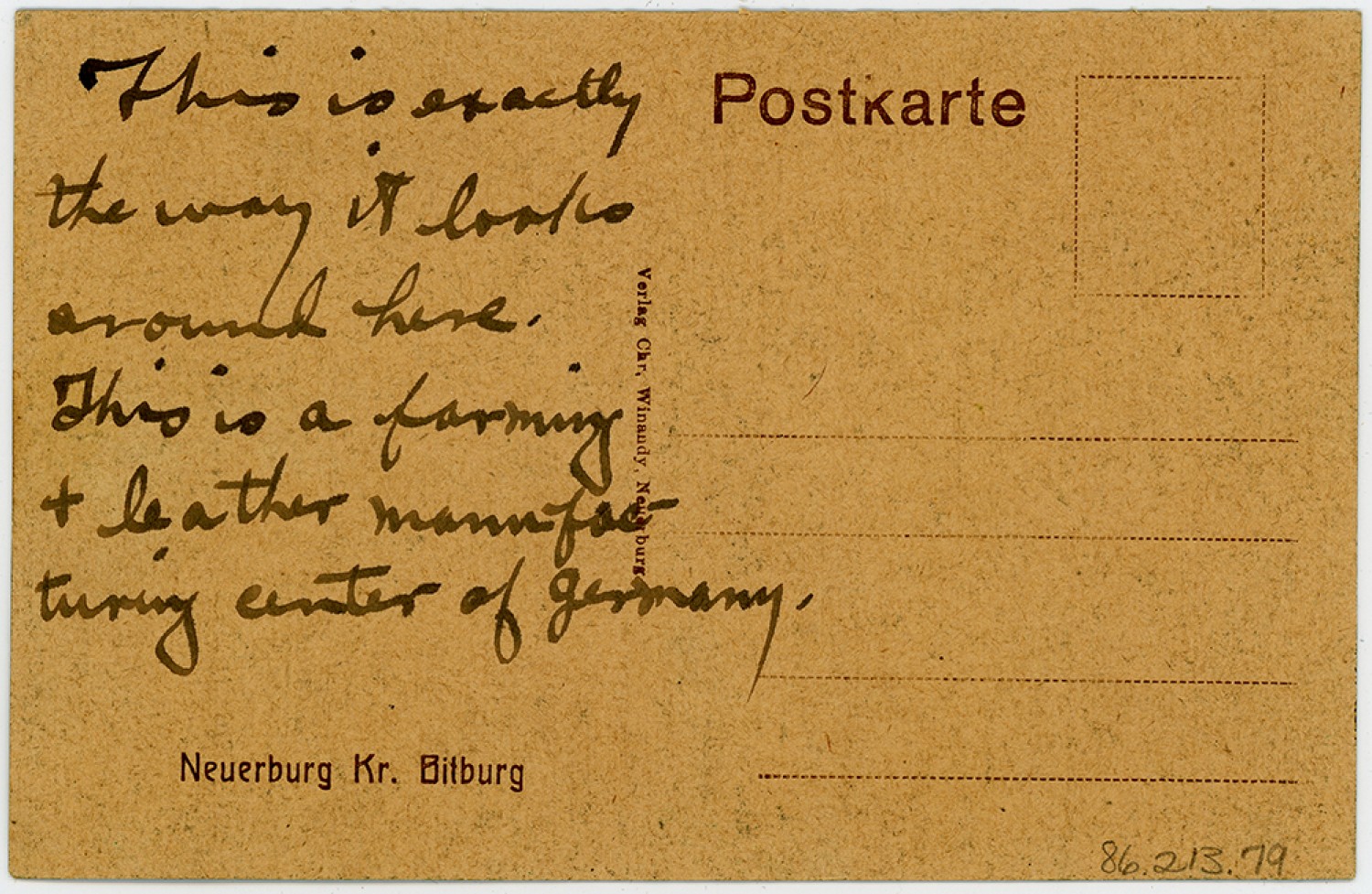 | Description | Postcard from James Kellogg Burnham Hockaday that portrays a farming and manufacturing center of Germany. Hockaday served in the 354th Infantry Regiment and was part of the Army of Occupation. |