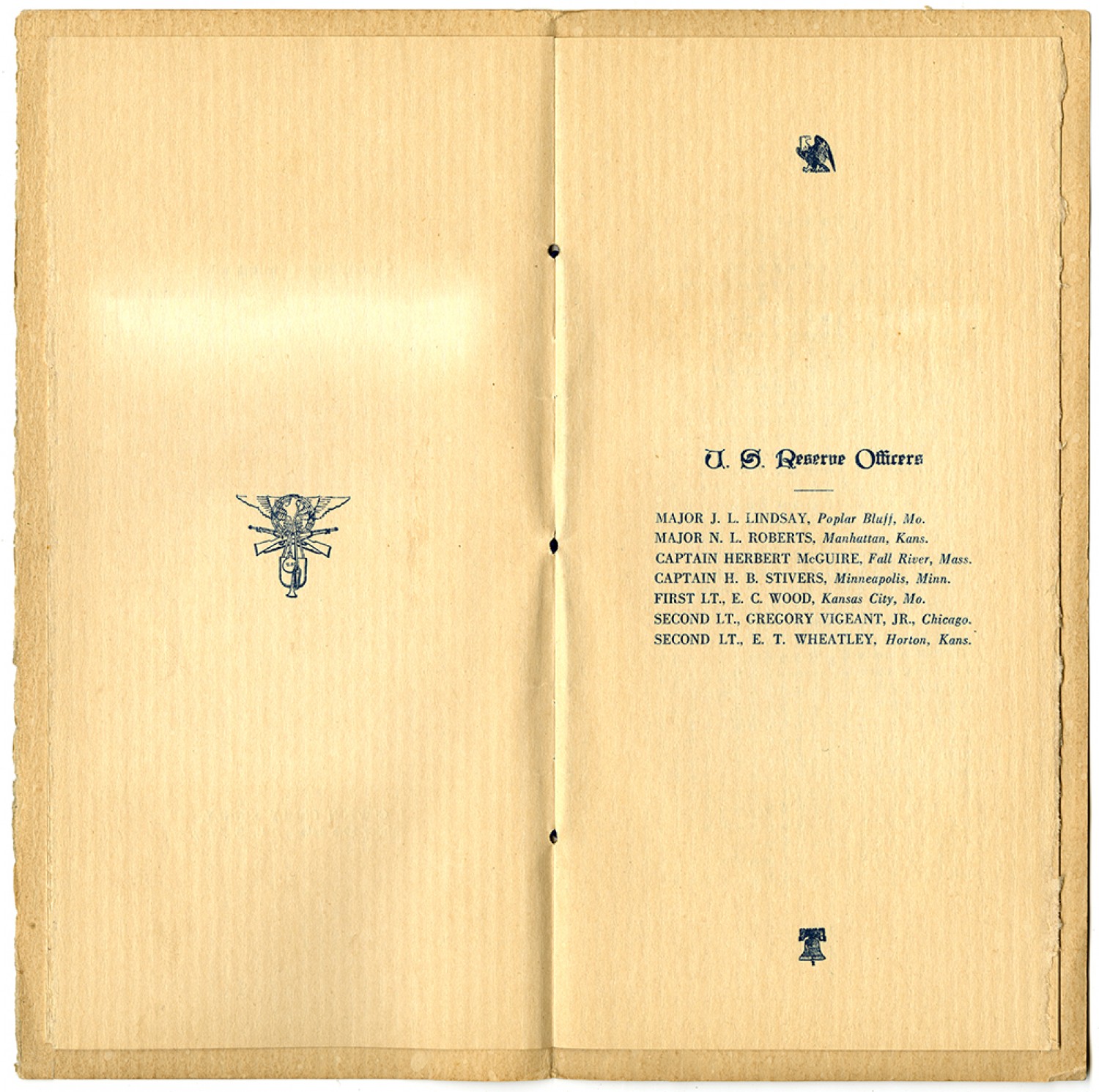 U.S. Reserve Officers MAJOR J. L. LINDSAY, Poplar Bluff, Mo. MAJOR N.L. ROBERTS, Manhattan, Kans. CAPTAIN HERBERT MCGUIRE, Fall River, Mass. CAPTAIN H.B. STIVERS, Minneapolis, Minn. FIRST LT., E.C. WOOD, Kansas City, Mo. SECOND LT., GREGORY VIGEANT, JR., Chicago. SECOND LT., E.T. WHEATLEY, Horton, Kans.