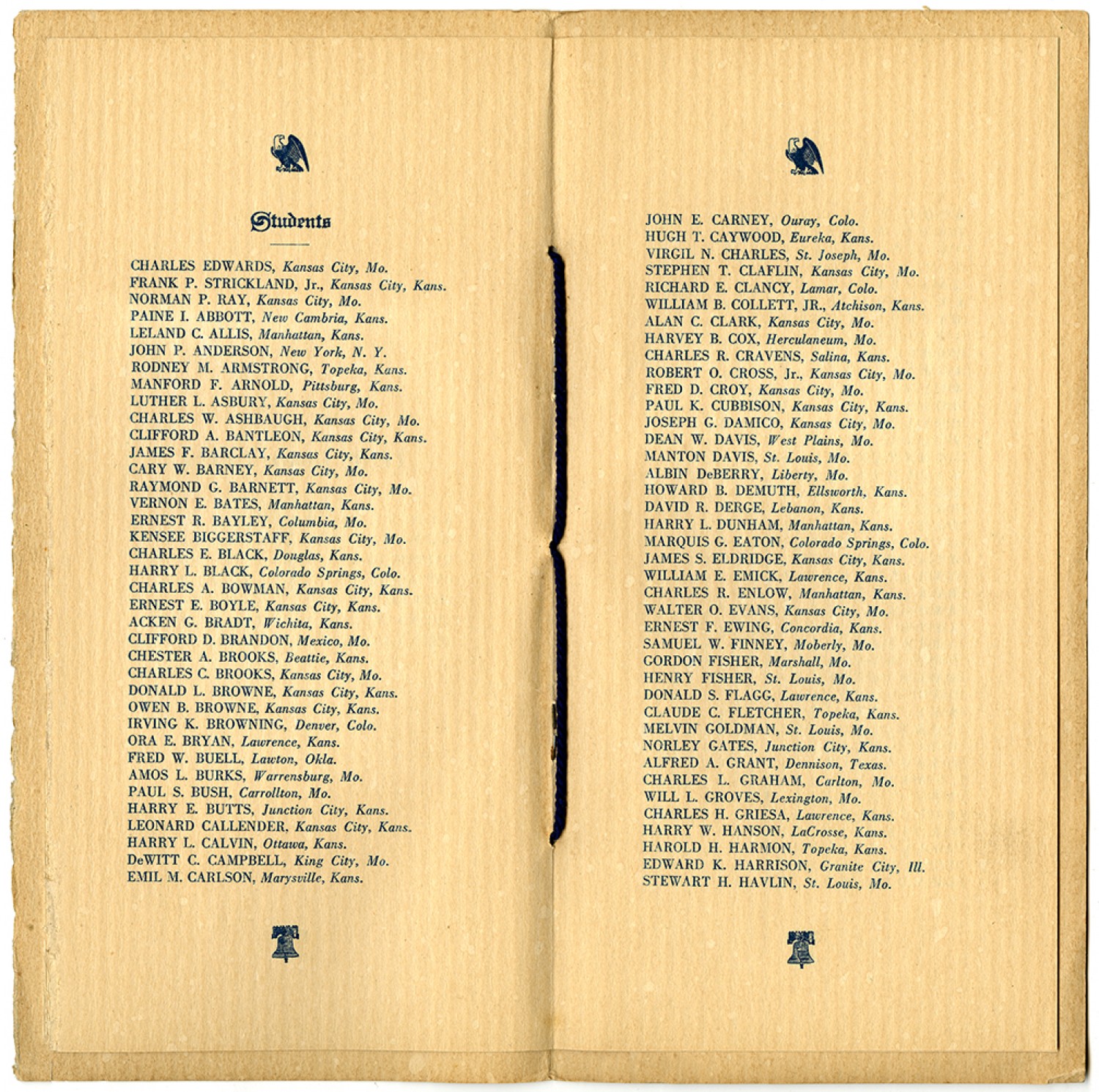 Students CHARLES EDWARDS, Kansas City, Mo. FRANK P. STRICKLAND, Jr., Kansas City, Kans. NORMAN P. RAY, Kansas City, Mo. PAINE I. ABBOTT, New Cambria, Kans. LELAND C. ALLIS, Manhattan, Kans. JOHN P. ANDERSON, New York, N.Y. RODNEY M. ARMSTRONG, Topeka, Kans. MANFORD F. ARNOLD, Pittsburg, Kans. LUTHER L. ASBURY, Kansas City, Mo. CHARLES W. ASHBAUGH, Kansas City, Mo. CLIFFORD A. BANTLEON, Kansas City, Kans. JAMES F. BARCLAY, Kansas City, Kans. CARY W. BARNEY, Kansas City, Mo. RAYMOND G. BARNETT, Kansas City, Mo. VERNON E. BATES, Manhattan, Kans. ERNEST R. BAYLEY, Columbia, Mo. KENSEE BIGGERSTAFF, Kansas City, Mo. CHARLES E. BLACK, Douglas, Kans. HARRY L. BLACK, Colorado Springs, Colo. CHARLES A. BOWMAN, Kansas City, Kans. ERNEST E. BOYLE, Kansas City, Kans. ACKEN G. BRADT, Wichita, Kans. CLIFFORD D. BRANDON, Mexico, Mo. CHESTER A. BROOKS, Beattie, Kans. CHARLES C. BROOKS, Kansas City, Mo. DONALD L. BROWNE, Kansas City, Kans. OWEN B. BROWNE, Kansas City, Kans. IRVING K. BROWNING, Denver Colo. ORA E. BRYAN, Lawrence, Kans. FRED W. BUELL, Lawton, Okla. AMOS L. BURKS, Warrensburg, Mo. PAUL S. BUSH, Carrollton, Mo. HARRY E. BUTTS, Junction City, Kans. LEONARD CALLENDER, Kansas City, Kans. HARRY L. CALVIN, Ottawa, Kans. DeWITT C. CAMPBELL, King City, Mo. EMIL M. CARLSON, Marysville, Kans. JOHN E. CARNEY, Ouray, Colo. HUGH T. CAYWOOD, Eureka, Kans., VIRGIL N. CHARLES, St. Joseph, Mo. STEPHEN T. CLAFLIN, Kansas City, Mo. RICHARD E. CLANY, Lamar, Colo. WILLIAM B. COLLETT, JR., Atchison, Kans. ALAN C. CLARK, Kansas City, Mo. HARVEY B. COX, Herculaneum, Mo. CHARLES R. CRAVENS, Salina, Kans. ROBERT O. CROSS, Jr., Kansas City, Mo. FRED D. CROY, Kansas City, Mo. PAUL K. CUBBISON, Kansas City, Kans. JOSEPH G. DAMICO, Kansas City, Mo. DEAN W. DAIVS, West Plains, Mo. MANTON DAVIS, St. Louis, Mo. ALBIN DeBERRY, Liberty, Mo. HOWARD B. DEMUTH, Ellsworth, Kans. DAVID R. DERGE, Lebanon, Kans. HARRY L. DUNHAM, Manhattan, Kans. WALTER O. EVANS, Kansas City, Mo. ERNEST F. EWING, Concordia, Kans. SAMUAL W. FINNEY, Moberly, Mo. GORDON FISHER, Marshall, Mo. HENRY FISHER, St. Louis, Mo. DONALD S. FLAGG, Lawrence, Kans. CLAUDE C. FLETCHER, Topeka, Kans. MELVIN GOLDMAN, St. Louis, Mo. NORLEY GATES Junction City, Kans. ALFRED A. GRANT, Dennison, Texas. CHARLES L. GRAHAM, Carlton, Mo. WILL L. GROVES, Lexington, Mo. CHARLES H. GRIESA, Lawrence, Kans. HARRY W. HANSON, LaCrosse, Kans. HAROLD H. HARMON, Topeka, Kans. EDWARD K. HARRISON, Granite City, Ill. STEWART H. HAVLIN, St. Louis, Mo.