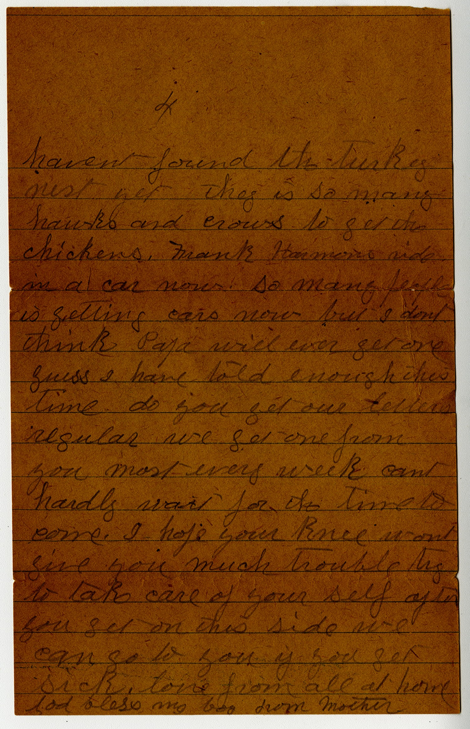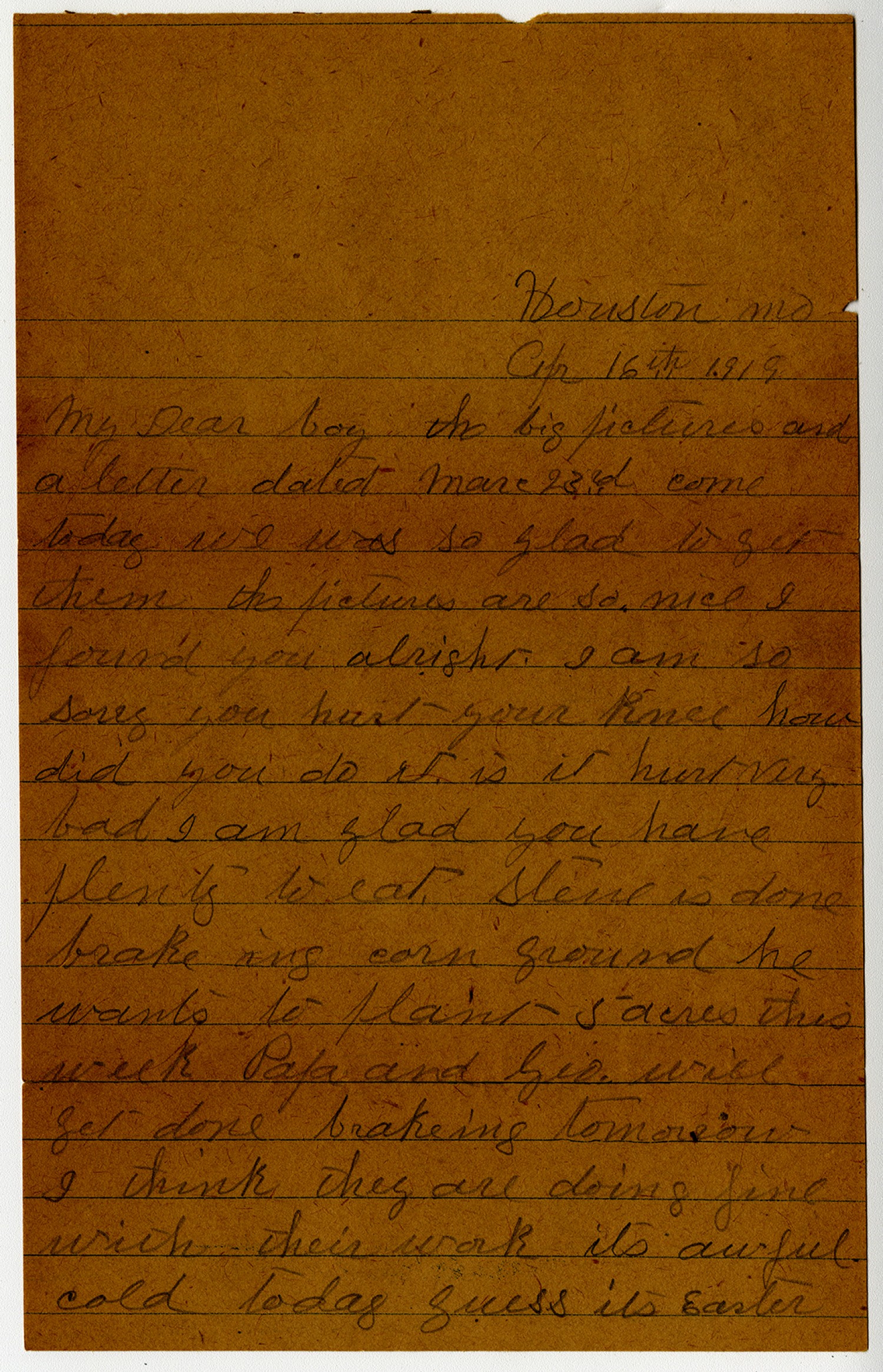 Houston [Missouri] [April] 16th 1919 My Dear boy the big pictures and a letter dated [March] 23rd come today we was so glad to get them the pictures are so nice I found you alright I am so sorry you hurt your knee how did you do it is it hurting bad I m glad you have plenty to eat Steve is done brakeing corn ground he wants to plant 5 acres this week Papa and Geo. will get done brakeing tomorrow I think they are doing fine with their work its awful cold today guess its Easter