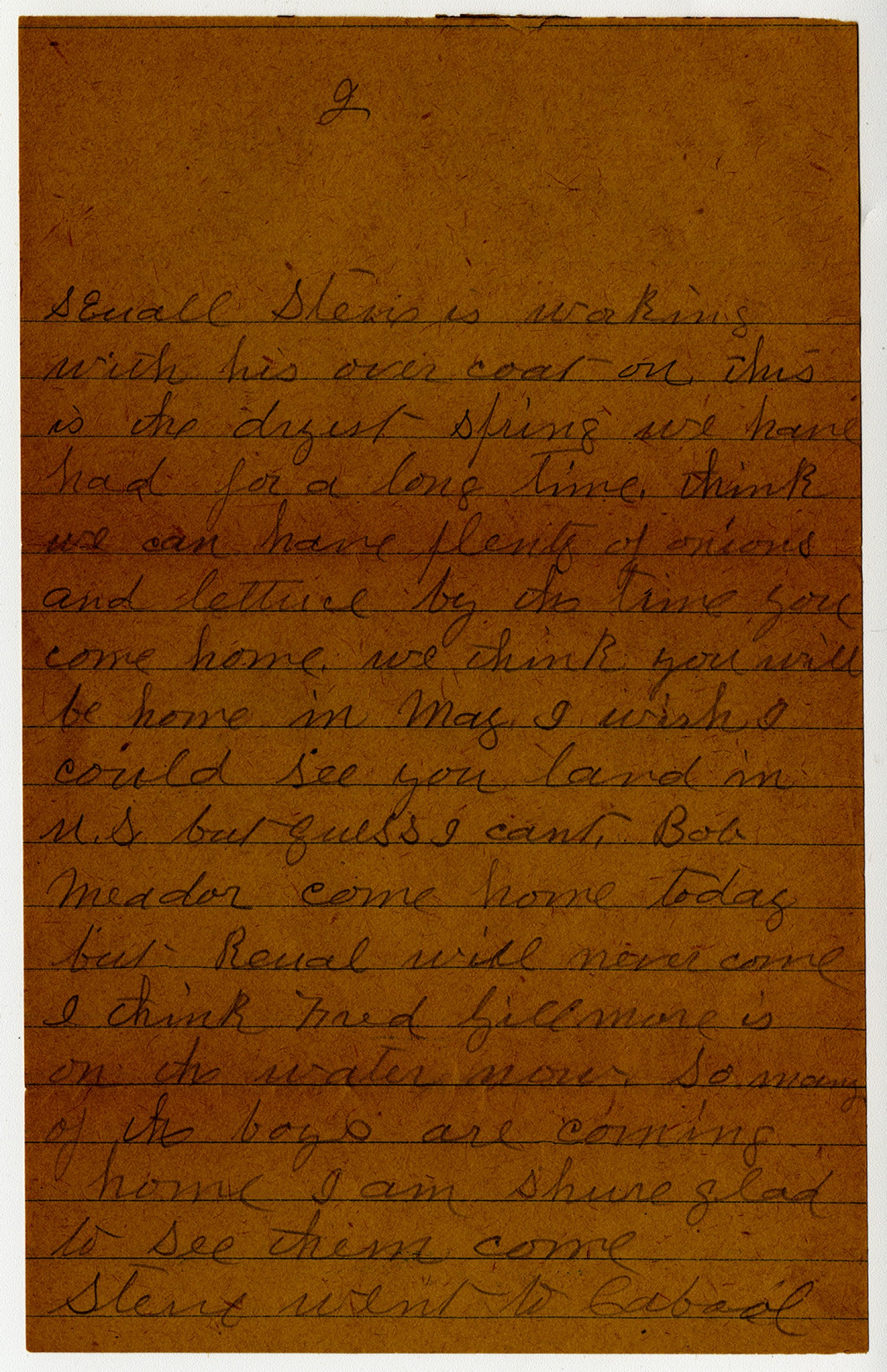 [page 2] Squall Steve is working with his over coat on this is the driest spring we have had for a long time. think we can have plenty of onions and lettuce by the time your come home. we think you will be home in May. I wish I could see you land in U.S. but guess I cant. Bob Meador come home today but Renal will never come I think Fred Gillmore is on the water now. So many of the boys are coming home I am shure glad to see them come Steve went to Cabool