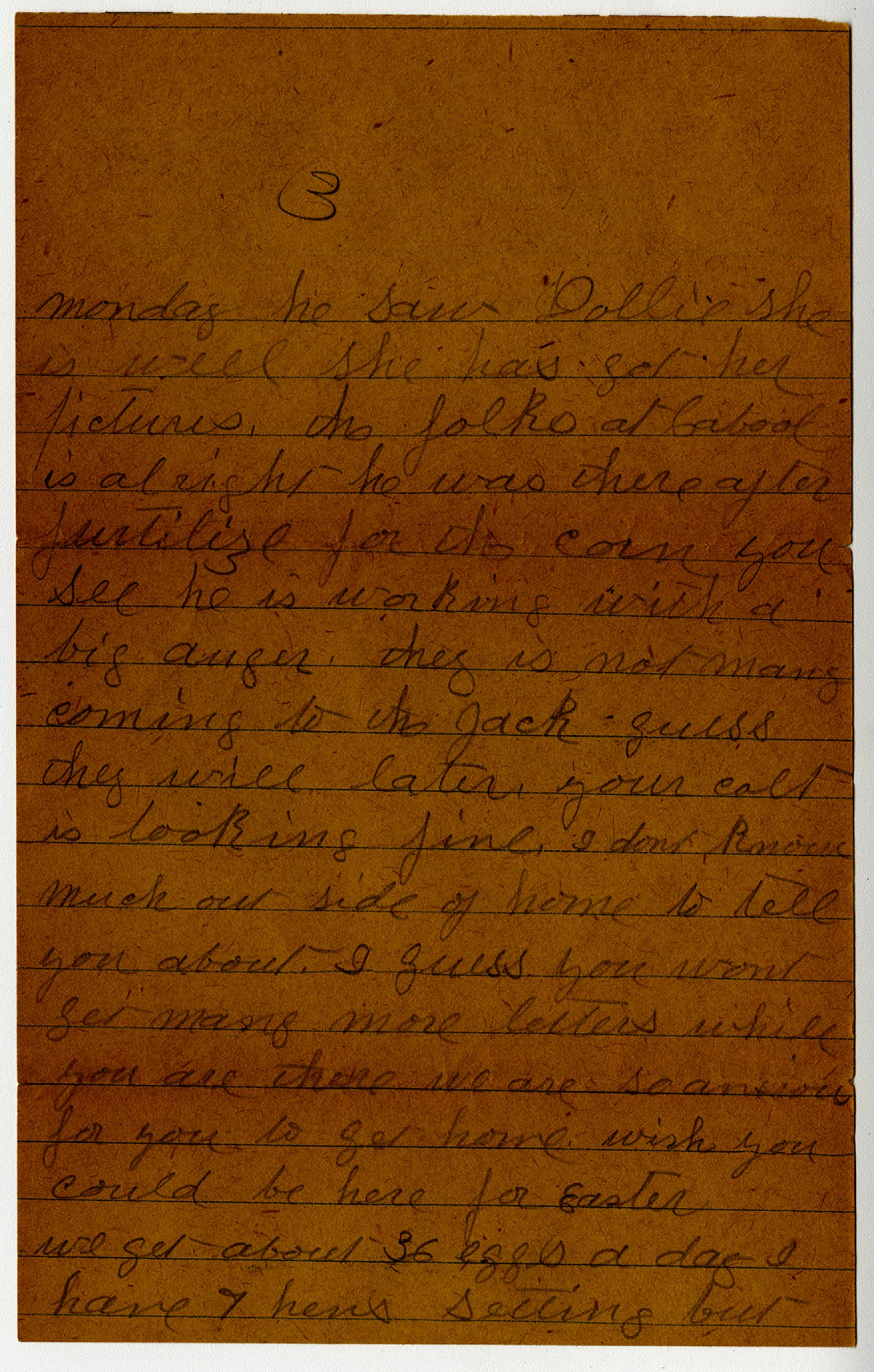 [page 3] Monday he saw Dollie She is well She has got her pictures. the folks at Cabool is alright he was there after furilize for the corn you see he is working with a big anger. they is not many coming to the Jack guess they will later. you colt is looking fine. I dont know much out side of home to tell you about. I guess you wont get many more letters while you are there we are so anxious for you to get home. wish you could be here for Easter we get about 36 eggs a day I have 7 hens setting but
