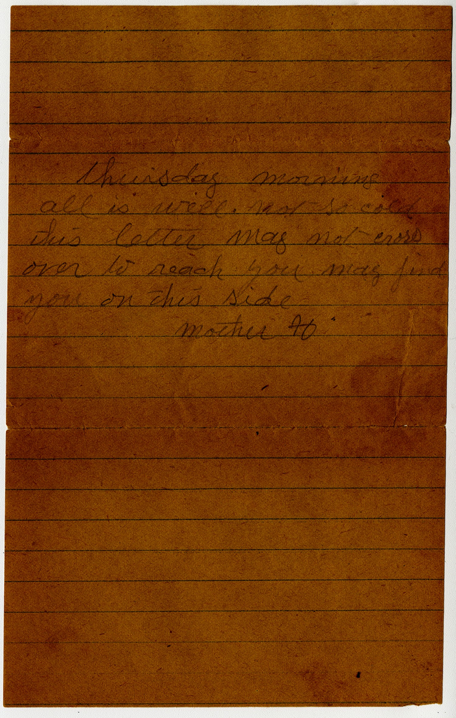 Thursday morning all is well. Not so cold this letter may not cross over to reach you may find you on this side Mother H