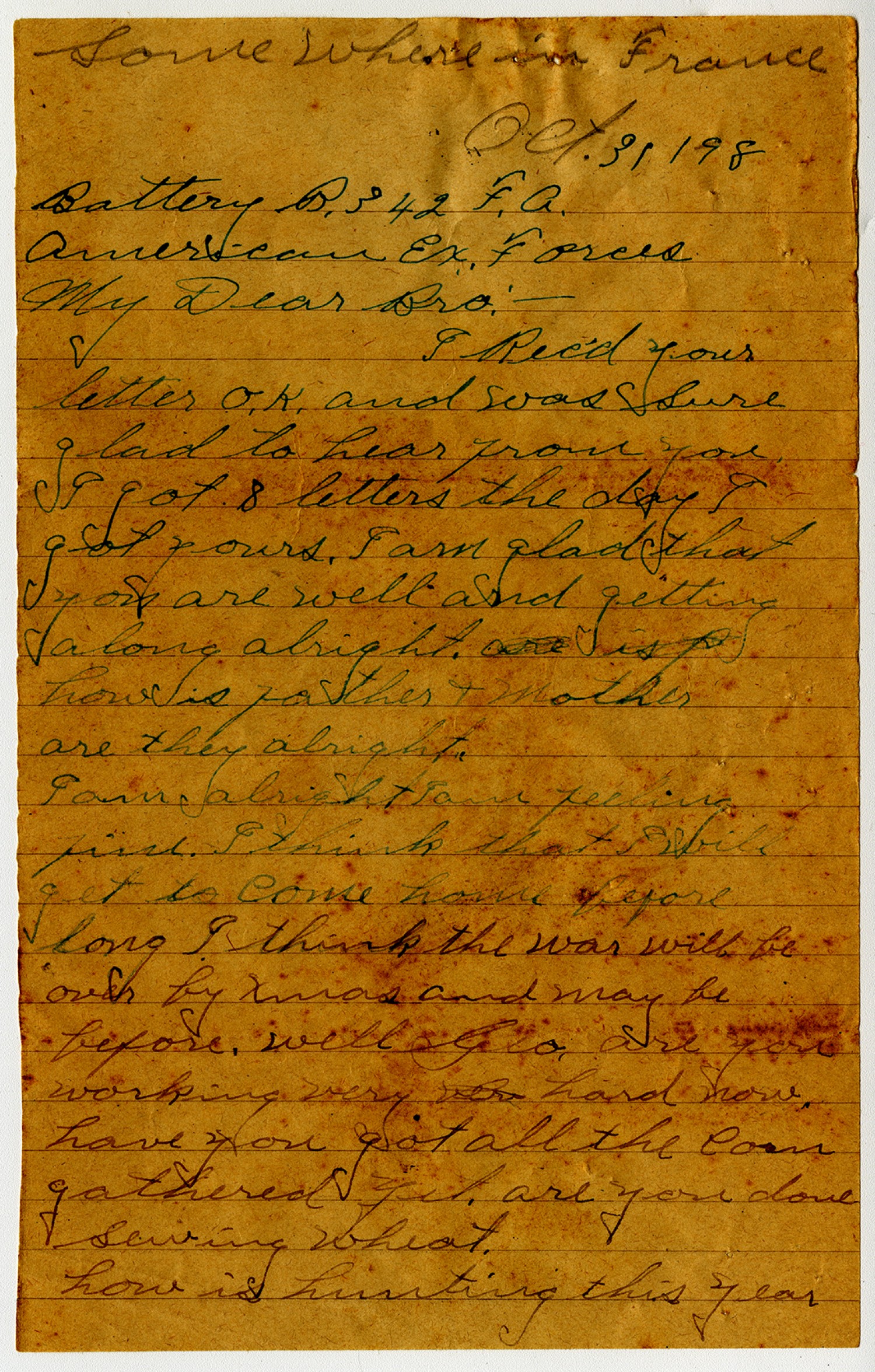 Some Where in France [October] 31, 1918 battery B. 342 F.A. American Ex. Forces My Dear Bro:- I Rec