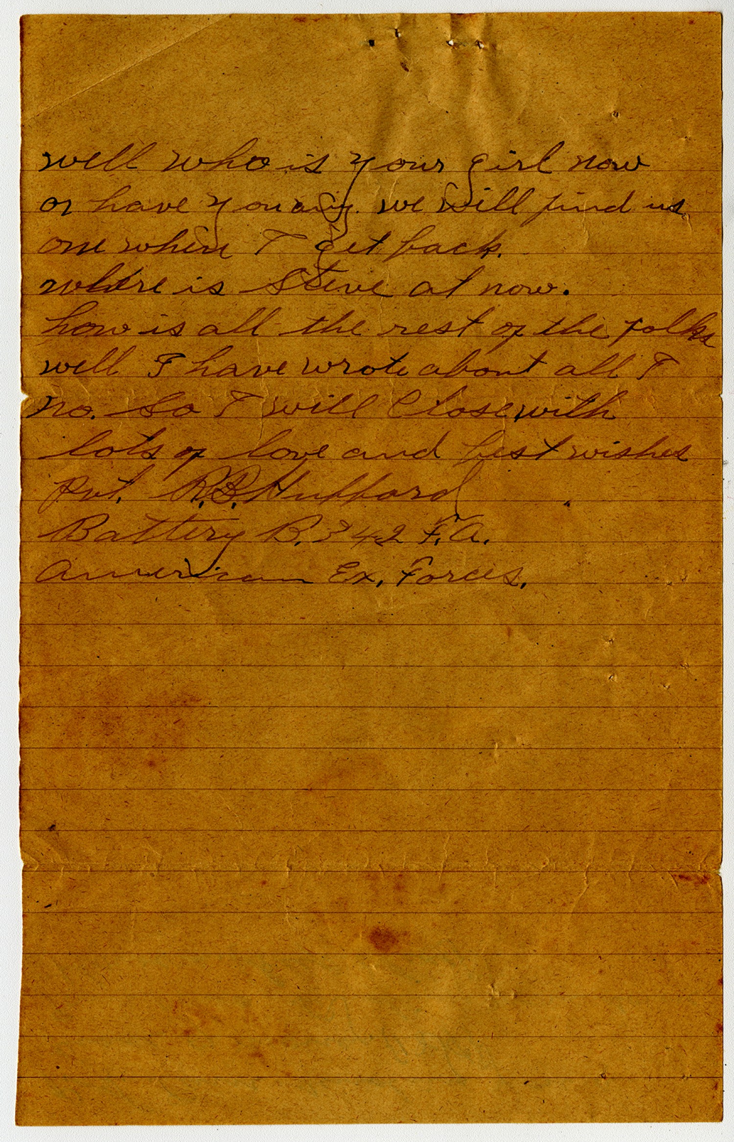 well who is your girl now or have you any. We will find us one when I get back. Where is Steve at now. how is all the rest of the folks well I have wrote about all I no. So I will Close with lots of love and best wishes Pvt. R.B. Hubbard Battery B. 342 F.A. American Ex. Forces