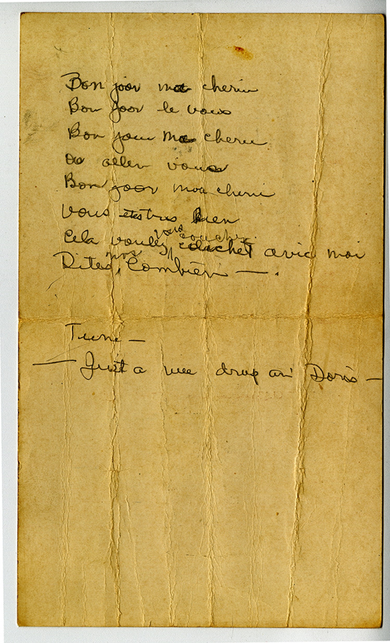 [French] Bon Joor Na cheriu Bon Joor le vous Bon jour Ma Cheru Ou alleu vous Bon joor moo cherie vous estes tres Bien Cela voules vous couchy colache avic noi Dites nos Combien - Tune - - Just a wee drop an’ Doris -