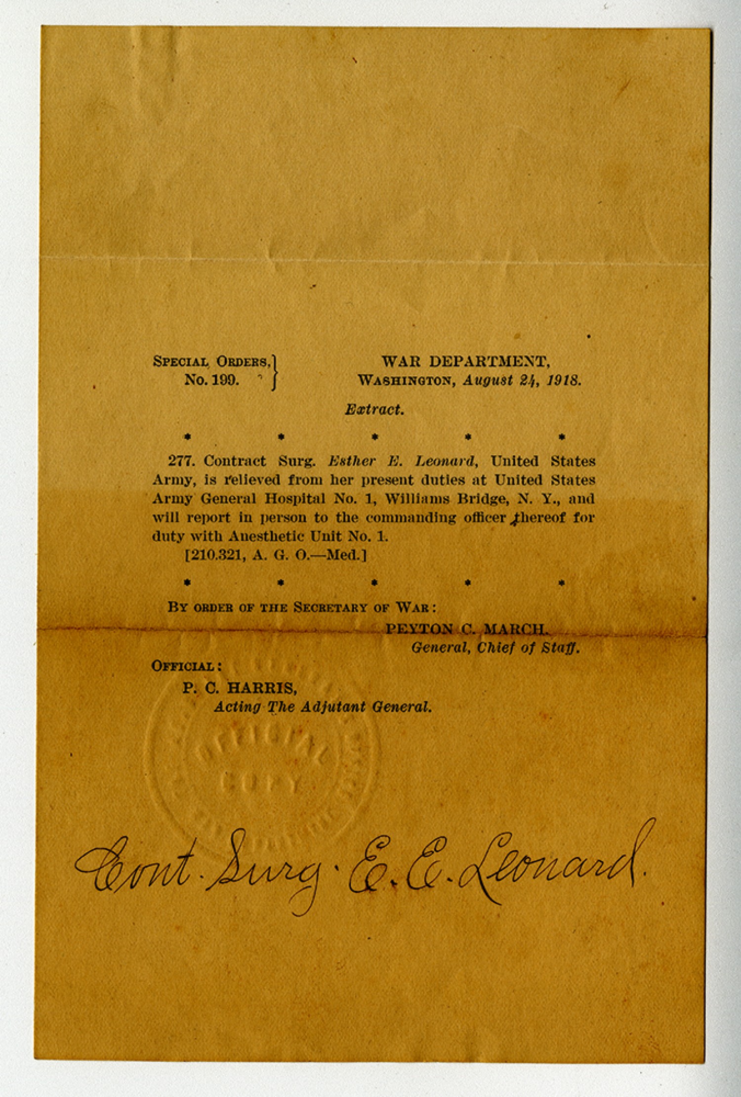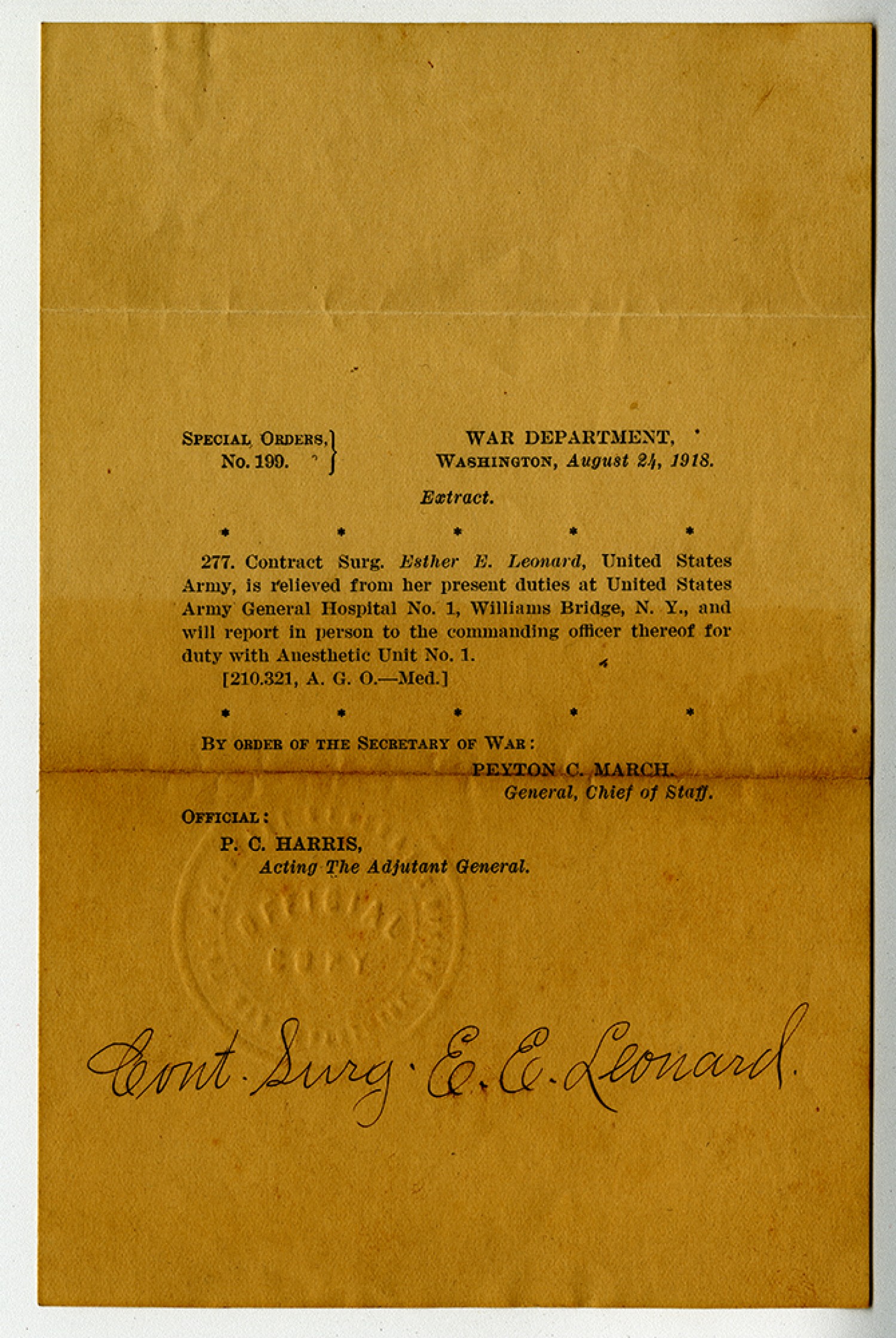 SPECIAL ORDERS, No. 199. WAR DEPARTMENT WASHINGTON, August 24, 1918. Extract. 277. Contract Surg. Esther E. Leonard, United States Army, is relieved from her present duties at United States Army General Hospital No. 1, Williams Bridge, [New York], and will report in person to the commanding officer thereof for duty with Anesthetic Unit No. 1. (210.321, A. G. O. - Med.) BY ORDER OF THE SECRETARY OF WAR: PEYTON C. MARCH, General, Chief of Staff. OFFICIAL: P.C. HARRIS, Acting The Adjutant General. Cont. Surg. E.E. Leonard.