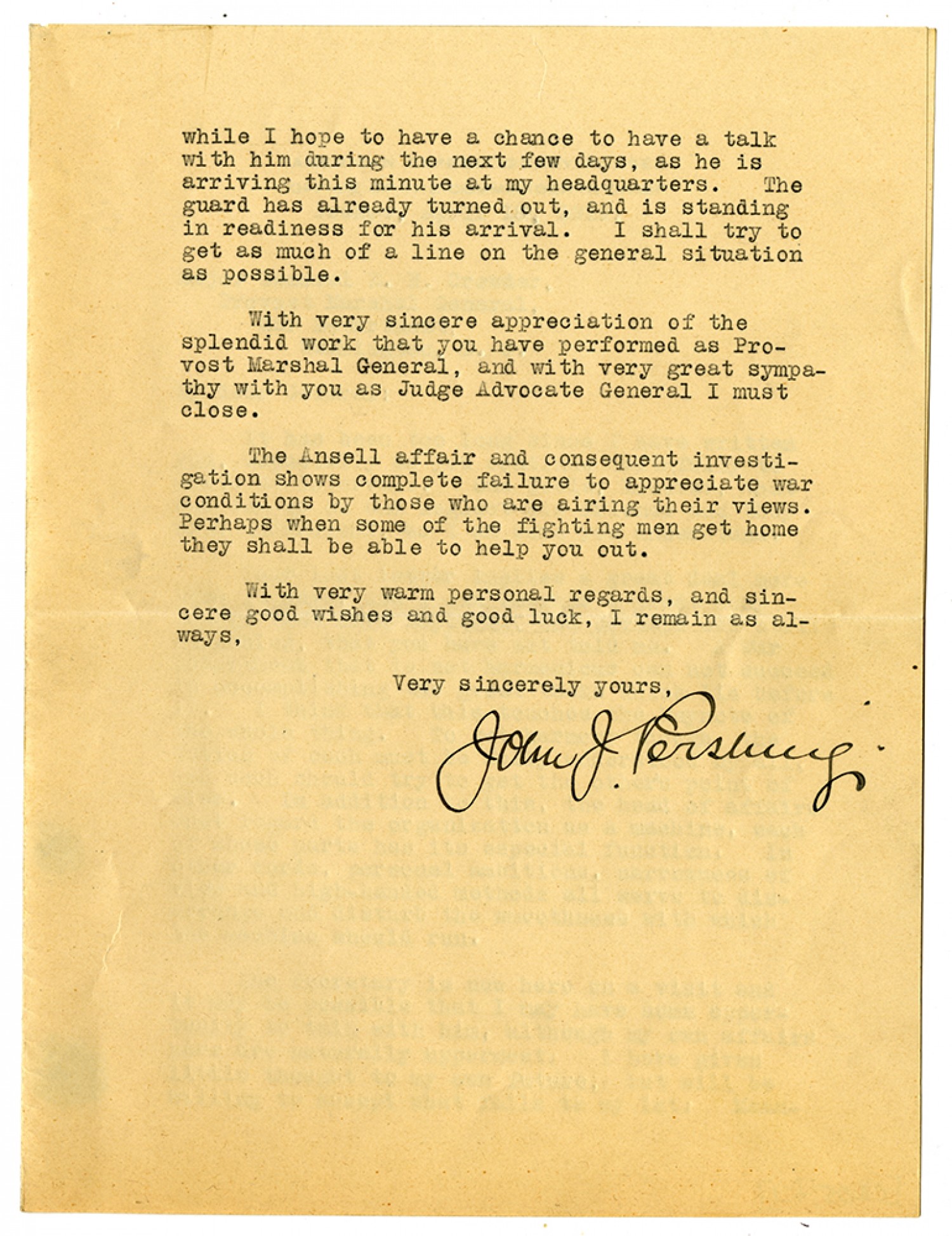 while I hope to have a chance to have a talk with him during the next few days, as he is arriving this minute at my headquarters. The guard has already turned out, and is standing in readiness for his arrival. I shall try to get much of a line on the general situation as possible. With very sincere appreciation of the splendid work that you have performed as Provost Marshal General, and with very great sympathy with you as Judge Advocate General I must close. The Ansell affair and consequent investigation shows complete failure to appreciate war conditions by those who are airing their views. Perhaps when some of the fighting men get home they shall be able to help you out. With very warm personal regards, and sincere good wishes and good luck, I remain as always, Very sincerely yours, [signed] John J. Pershing