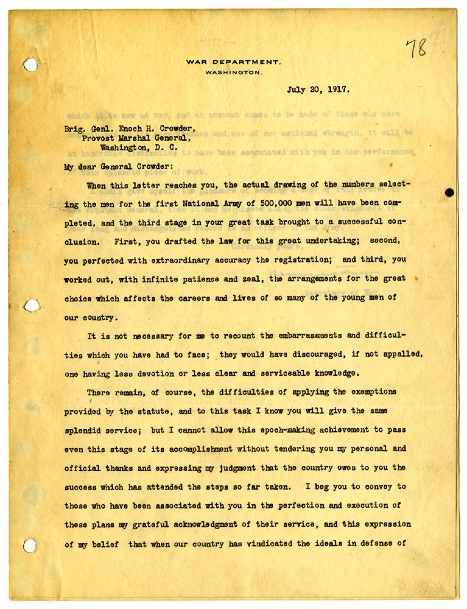WAR DEPARTMENT. WASHINGTON July 20, 1917. Brig. Genl. Enoch H. Crowder, Provost Marshal General, Washington, D.C. My dear General Crowder: When this letter reaches you, the actual drawing of the numbers selecting the men for the first National Army 500,000 men will have been completed, and the third stage in your great task brought to a successful conclusion. First, you drafted the law for this great undertaking; second, you perfected with extraordinary accuracy the registration; and third, you worked out, with infinite patience and zeal, the arrangements for the great choice which affects the careers and lives of so many of the young men of our country. It is not necessary for me to recount the embarrassments and difficulties which you have had to face; they would have discouraged, if not appalled, one having less devotion or less clear and serviceable knowledge. There remain, of course, the difficulties of applying the exemptions provided by the statute, and to this task I know you will give the same splendid service; but I cannot allow this epoch-making achievement to pass even this stage of its accomplishment without tendering you my personal and official thanks and expressing my judgment that the country owes to you the success which has attended the steps so far taken. I beg you to convey to those who have been associated with you in the perfection and execution of these plans my grateful acknowledgment of their service, and this expression of my belief that when our country has vindicated the ideals in defense of