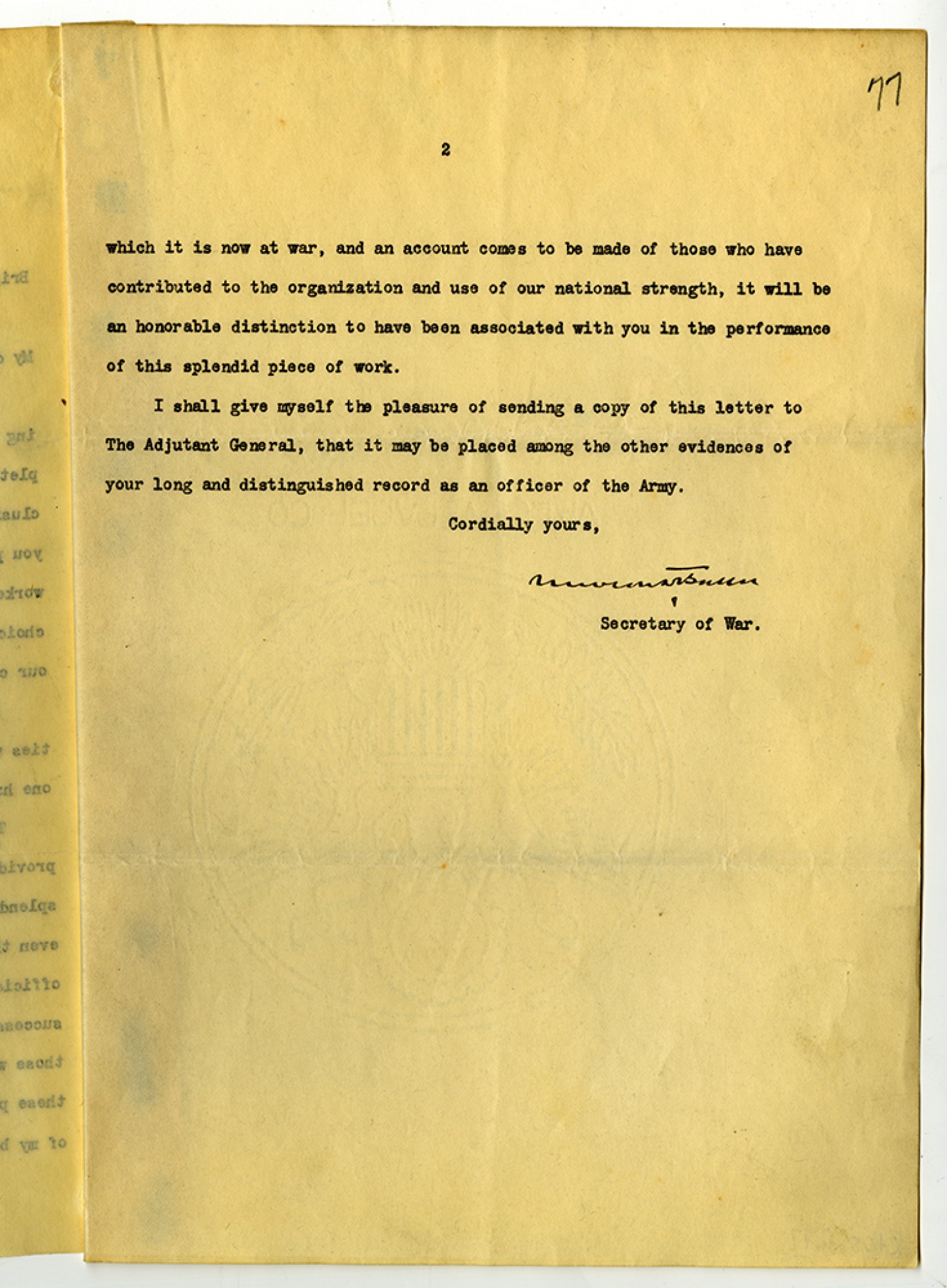 [page 2]which it is now at war, and an account comes to be made of those who have contributed to the organization and use of our national strength, it will be an honorable distinction to have been associated with you in the performance of this splendid piece of work. I shall give myself the pleasure of sending a copy of this letter to The Adjutant General, that it may be placed among the other evidences of your long and distinguished record as an officer of the Army. Cordially yours, [signed] Newton Baker Secretary of War.