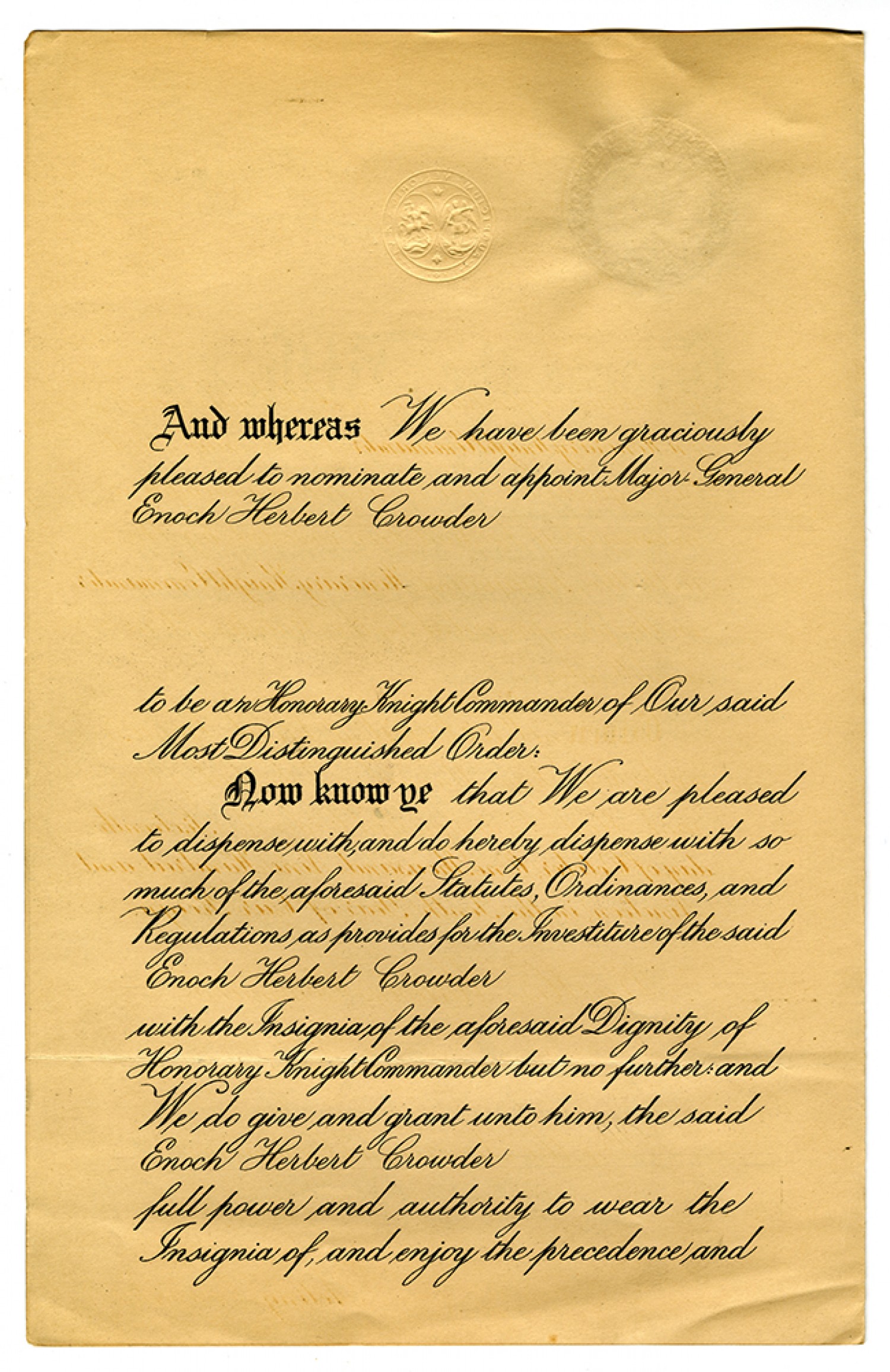 And whereas We have been graciously pleased to nominate and appoint Major General Enoch Herbert Crowder to be an Honorary Knight Commander of Our said Most Distinguished Order: Now know ye that We are pleased to dispense with, and do hereby dispense with so much of the aforesaid Statutes, Ordinances, and Regulations as provides for the Investiture of the said Enoch Herbert Crowder with the Insignia of the aforesaid Dignity of Honorary Knight Commander but no further: and We do give and grant unto him, the said Enoch Herbert Crowder full power and authority to wear the Insignia of, and enjoy the precedence and