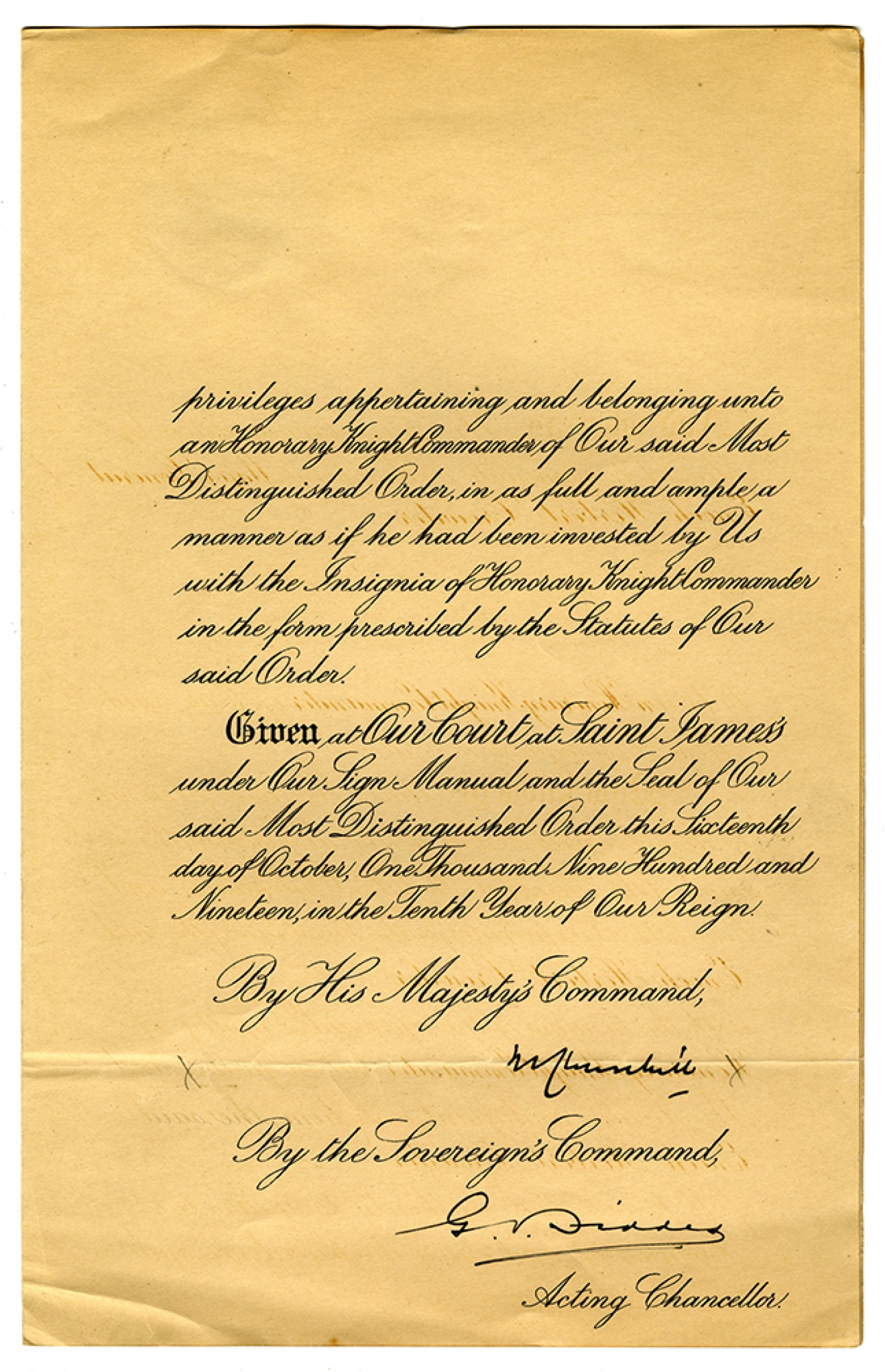 privileges appertaining and belonging unto an Honorary Knight Commander of Our said Most Distinguished Order, in as full and ample a manner as if he had been invested by Us with the Insignia of Honorary Knight Commander in the form prescribed by the Statutes of Our said Order. Given at Our Court at Saint James under Our Sign Manual and the Seal of Our said Most Distinguished Order this Sixteenth day of October, One Thousand Nine Hundred and Nineteen, in the Tenth Year of our Reign. By His Majesty's Command, [signature] By the Sovereign's Command, [signature] Acting Chancellor.