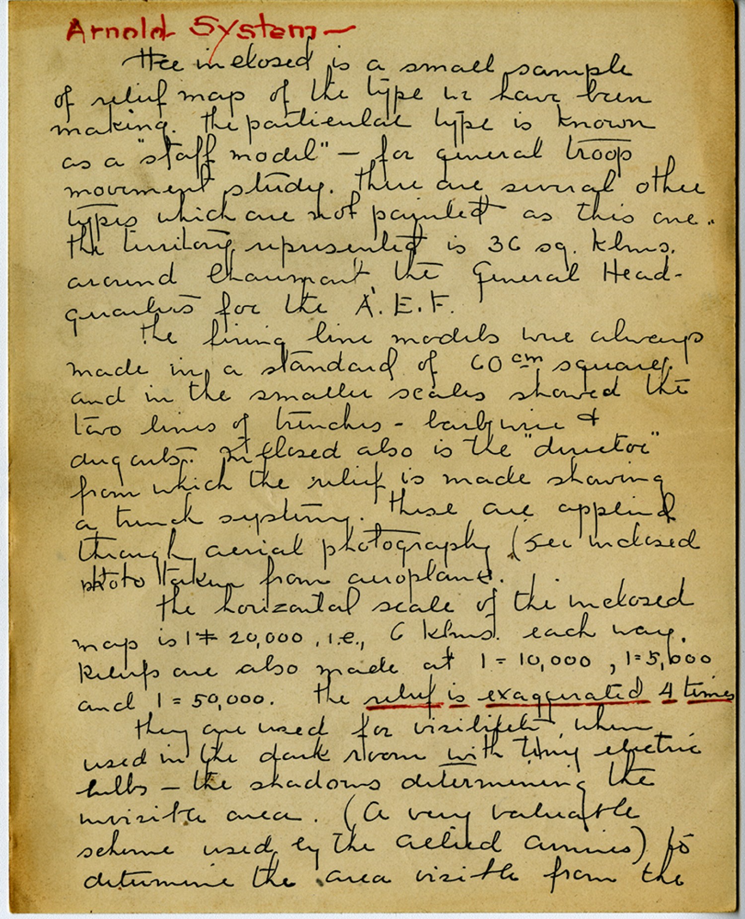 Arnold System – The inclosed is a small sample of relief map of the type we have been making. The particular type is known as a “staff model’ – for general troop movement study. There are several other types which are not painted as this one. The territory represented is 36 sq. klms. around Chaumont, the general Headquarters for the A.E.F. The firing line models were always made in a standard of 60 cm square and in the smaller scales showed the two lines of trenches – barbwire & dugouts. Inclosed also is the “director” from which the relief is made showing a trench system. these are applied through aerial photography (see inclosed photo taken from aeroplane. the horizontal scale of the inclosed map is 1 = 20,000, i.e. 6 klms. each way. Reliefs are also made at 1 = 10,000, 1 = 5,000 and 1 = 50,000. The relief is exaggerated 4 times. They are used for visibility when used in the dark room with tiny electric bulbs – the shadows determining the invisible area. (A very valuable scheme used by the Allied Armies) to determine the area visible from the
