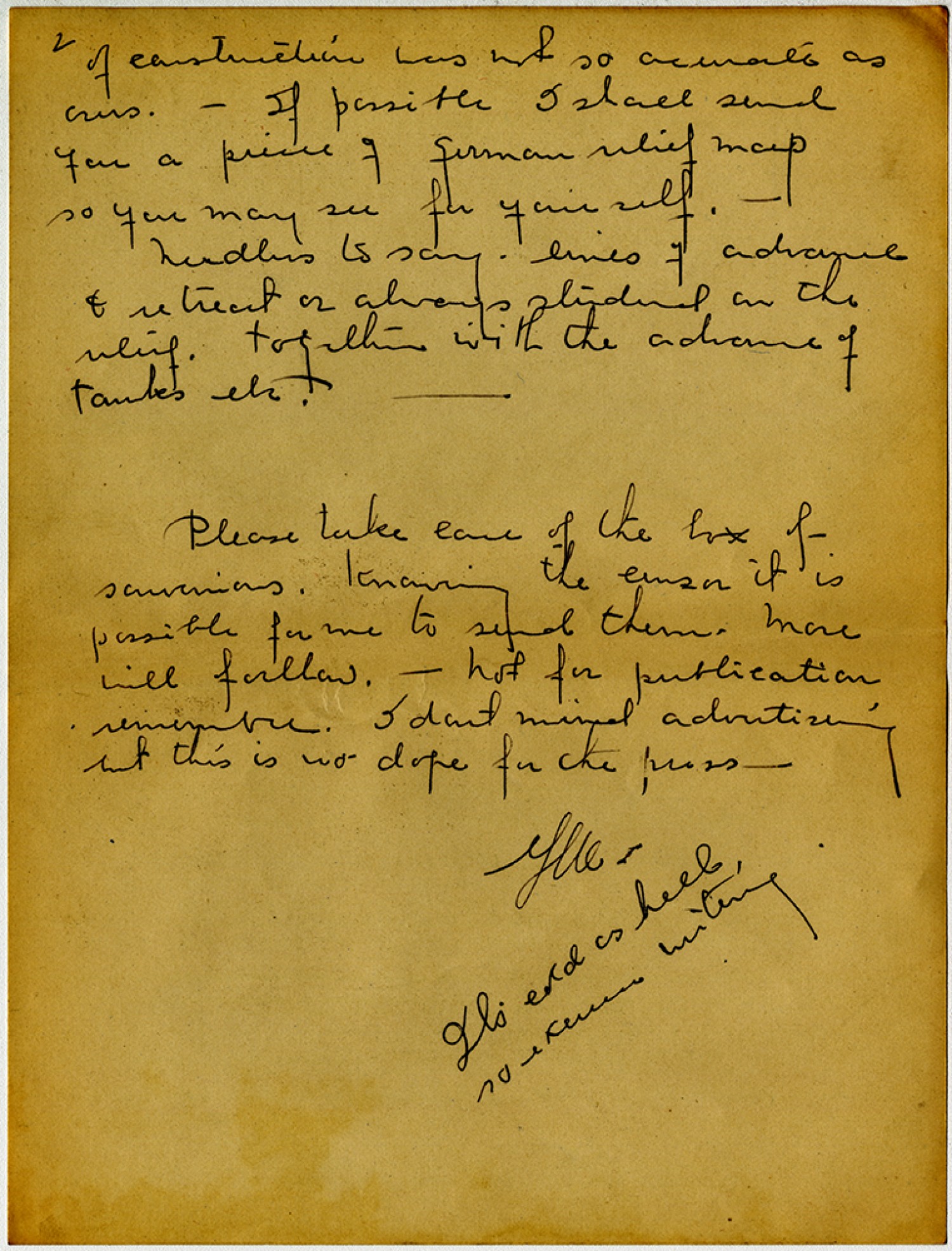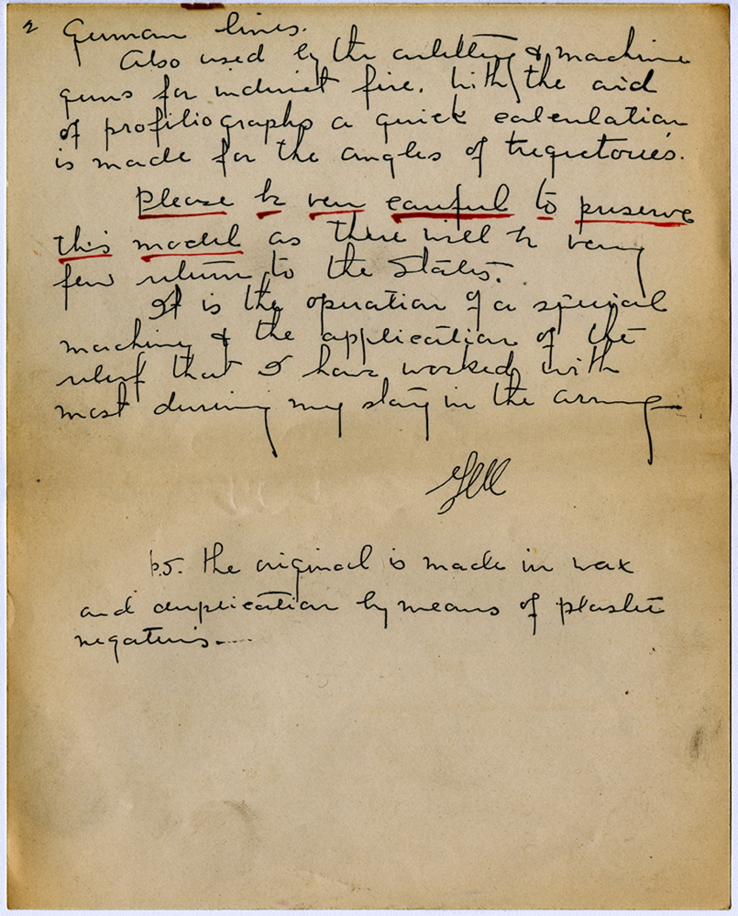 [page 2] german lines. Also used by the artillery & machine guns for indirect fire. With the aid of profilio graphs a quick calculation is made for the angles of tregectories. Please be very careful to preserve this model as there will be very few return to the States. It is the operation of a special machine & the application of the relief that I have worked with most during my stay in the Army. [George Maguolo] P.S. The original is made in wax and duplication by means of plastic negatives.