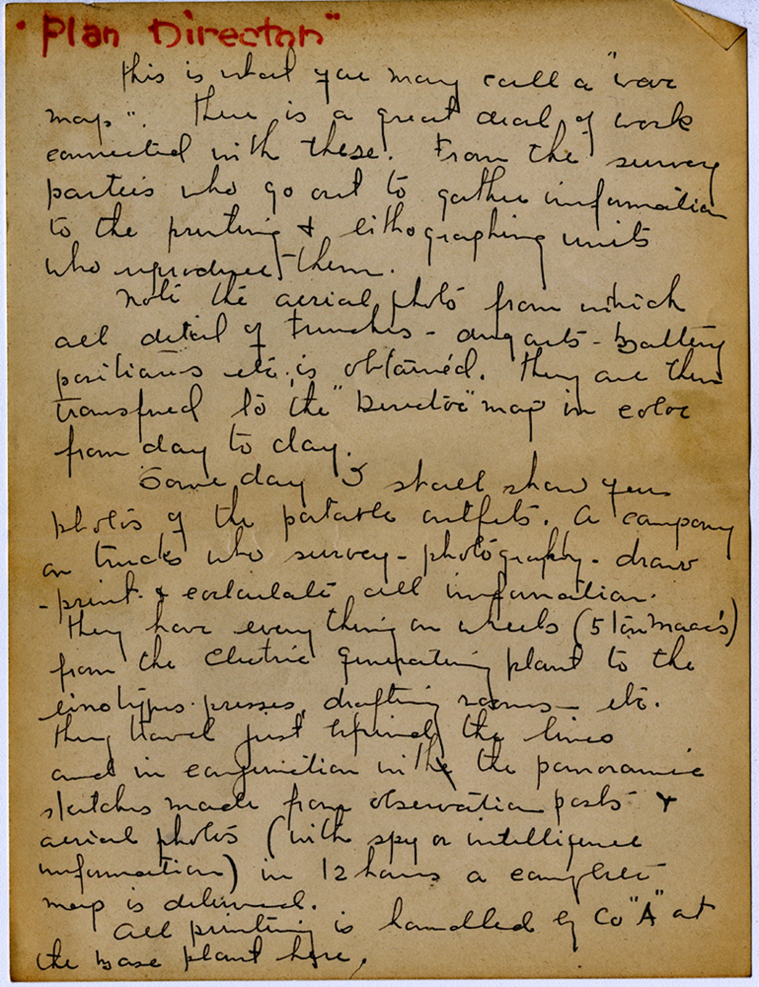 “Plan Direction” This is what you call a “war map.” There is a great deal of work connected with these. From the survey parties who go out to gather information to the printing & lithography units who reproduce them. Note the aerial photo from which all detail of trenches – dugouts – Battery positions etc. is obtained. they are then transferred to the “Director” map in color from day to day. Some day I shall show you photos of the protable outfits. A company on trucks who survey – photography – draw – print and calculate all information. they have every this on wheels (5 ton Mace’s) from the Electric generating plant to the linotypes presses drafting rooms – etc. they travel just behind the lines and in conjunction with the panoramic sketches made from observation posts & aerial photos (with spy or intelligence information) in 12 hours a complete map is delivered. All printing is handled by Co “A” at the base plant here.